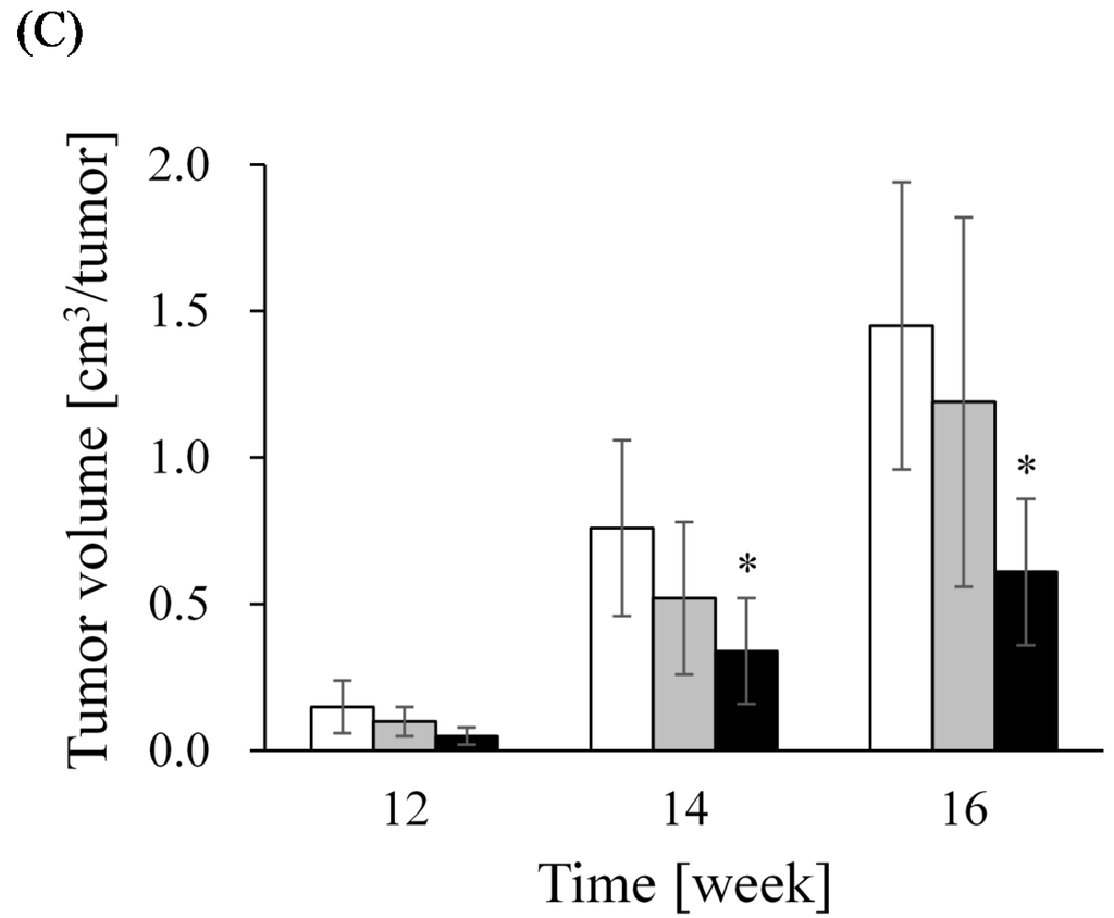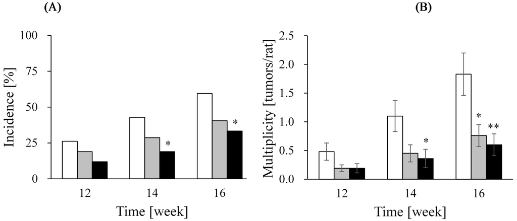 Time course changes in palpable mammary tumors in PhIP-exposed rats in 12th, 14th and 16th week after the start of the experiment. (A) Tumor incidence; (B) multiplicity; and (C) tumor volume. White bar, control; gray bar, soy milk and black bar, fermented soy milk beverage. All the data were expressed as the mean ± SE. The tumor incidence was analyzed using the χ2 test. The tumor multiplicity and volume were analyzed using the Dunnett test relative to the control group []. * p < 0.05; ** p < 0.01. Kaga C. et al. Unpublished data [].