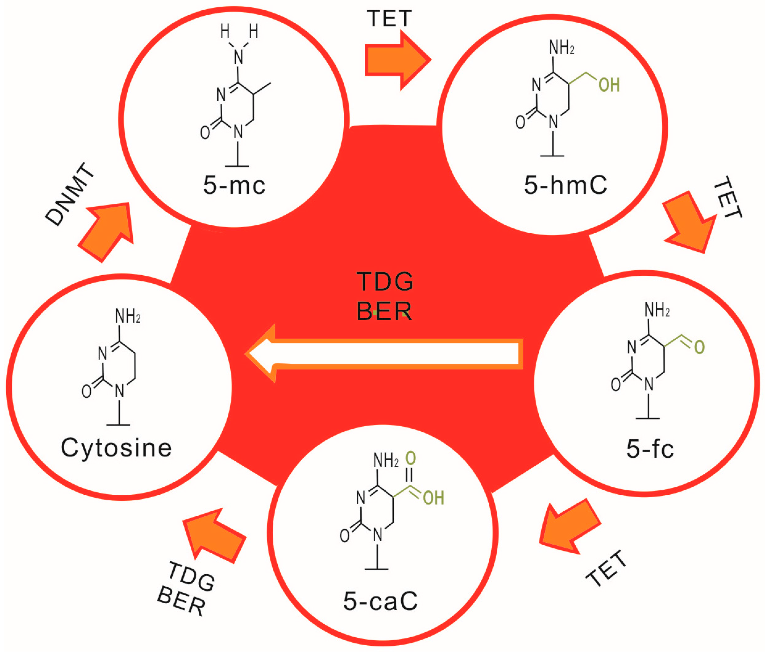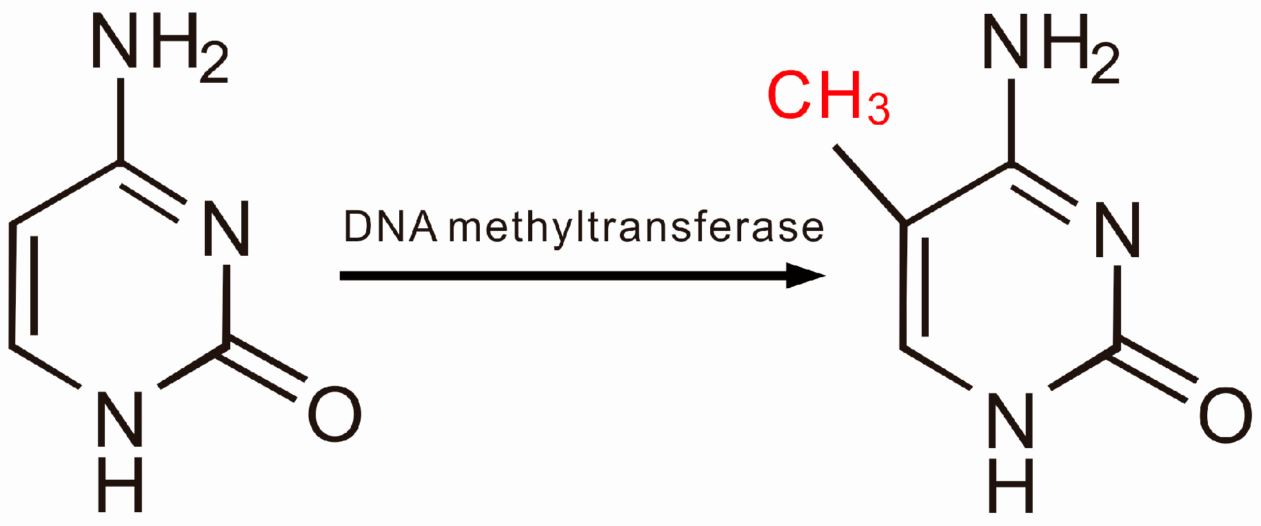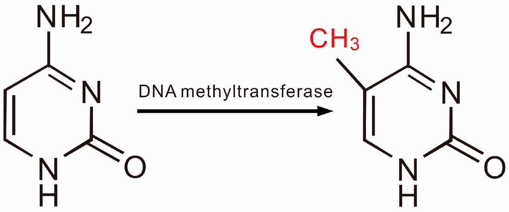 DNA methylation is a biochemical process in which a methyl group is added to a cytosine or adenine at the 5' position of a CpG dinucleotide, converting the cytosine to methyl-cytosine [15] (Figure 1). When present, this methylation serves as a mark that indicates repression of gene expression, and DNA methylation is therefore involved in many biological processes, such as cell differentiations and immune responses. The process of DNA methylation is regulated by methyltransferases, such as DNMT1, DNMT3a and DNMT3b, and each displays capacity different functional capacity. For example, DNMT1 maintains the methylation status during cell replication, whereas DNMT3a and 3b usually induce de novo methylation [16]. In contrast, DNA demethylation re-activates or re-expresses silenced genes, a process that is also regulated by enzymes, such as TET1, TET2 and TET3 (Figure 2). In mammalian cells, DNA methylation is restricted to regions of high CpG dinucleotide content, also known as CpG islands, which are typically present in promoter regions [17].