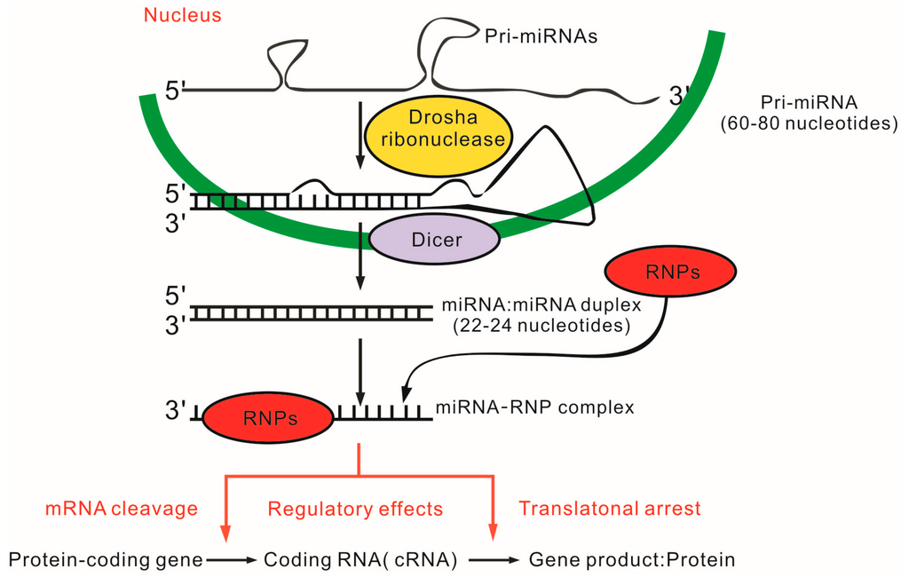 Gene regulation by miRNAs. miRNA genes are transcribed by RNA polymerase II in the nucleus to compose primary miRNAs (pri-miRNAs). The latter ones are recognized by nuclear enzymes, such as Drosha, forming ~70-nucleotide hairpin precursor miRNAs (pre-mRNAs). Mature miRNAs are cleaved from pre-mRNAs, by the enzyme Dicer, with a duplex form 18–23 nucleotides in length. One of these two strands with lower stability in the 5' end will be associated with the RNA induced silencing complex (RISC), the place that miRNAs bind to the mRNA targets. The predominant regulatory effect of miRNAs is to repress their target mRNAs.