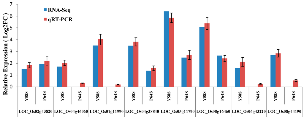 Comparison of genes expression levels using RNA-Seq and qRT-PCR. The relative expression values were normalized to the rice actin 1 gene. Error bars indicate standard deviation. Log2FC refers to the log2 fold change.