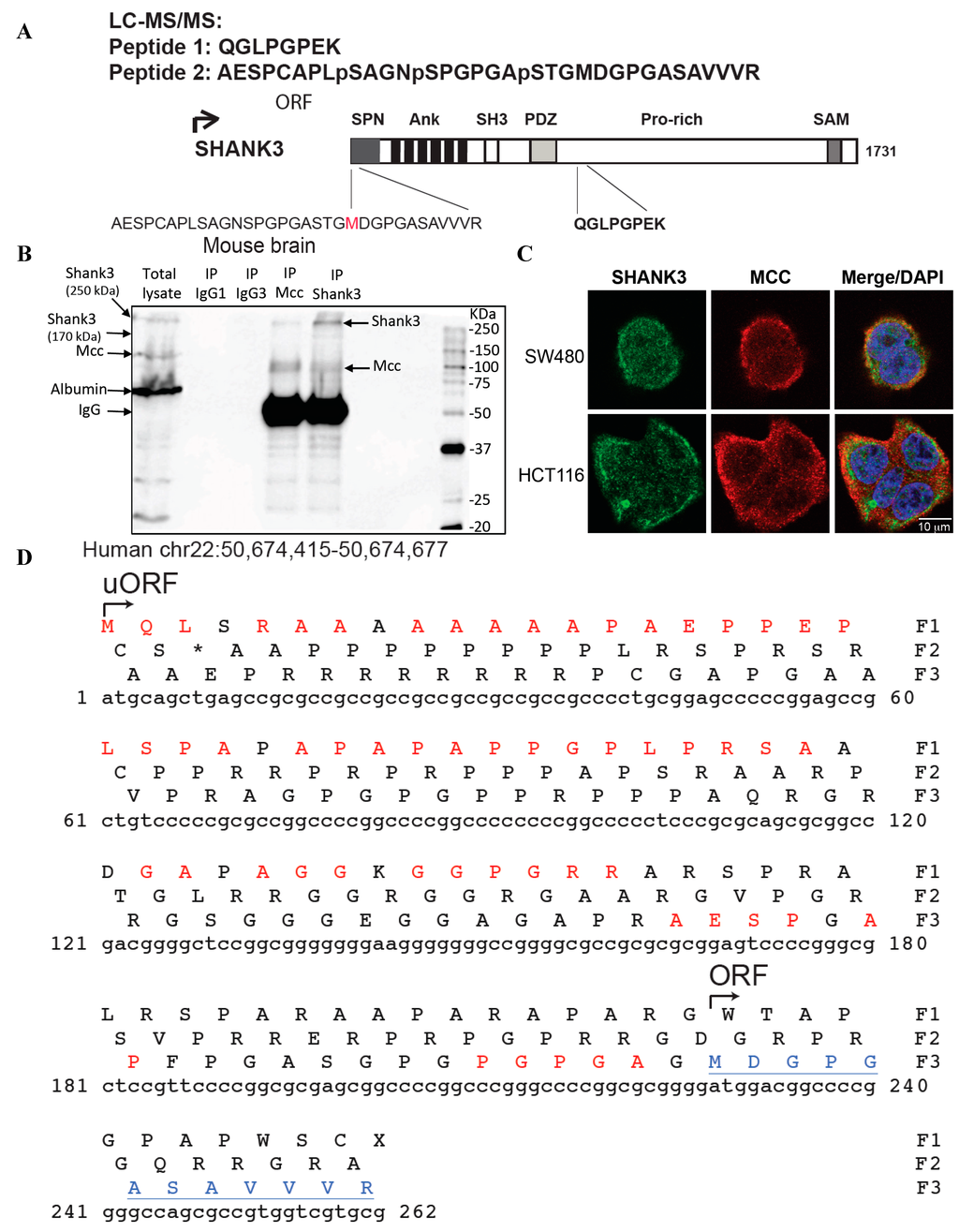 Identification of a new human SHANK3 isoform. (A) LC-MS/MS identifies a SHANK3 tryptic peptide (Peptide 2) corresponding to a novel human SHANK3 isoform previously only identified in mouse and rat. Endogenous MCC was immunoprecipitated from SW480 human colon cancer cells. The immunoprecipitate was processed for LC-MS/MS and the data searched using Mascot. Among the tryptic peptides identified, two peptides corresponded to the SHANK3 protein; (B) Endogenous Mcc interacts with endogenous Shank3 in mouse brain tissue. Endogenous Shank3 and Mcc were immunoprecipitated (IP) from mouse brain tissue. Lysates and immunoprecipitates were run and blotted for Shank3 and Mcc; (C) Confocal microscopy for paraformaldehyde-fixed SW480 and HCT116 cells probed with anti-SHANK3 (green) and anti-MCC antibodies (red) show partial cell membrane colocalisation; (D) Shown is the region of the human genome sequence encompassing chr22:50,674,415 to chr22:50,674,677 that was extracted from UCSC Dec 2013. GRCh38/hg38. ORF: Open Reading Frame; uORF: upstream Open Reading Frame. Translation of chr22:50,674,415 to chr22:50,674,677 using three open reading frames. Amino acids in red are found in the mouse or rat Shank3 protein. The predicted new N-terminal amino acids sequence is derived from the first 54aa of Frame 1 (F1) followed by the second tryptic peptide. The beginning of the known translated region is underlined in blue; (E) Multiple alignment of mouse Shank3, rat Shank3 and predicted human SHANK3 was done using the software ClustalW2.1. Asterisks indicate conservation between mouse, rat and the predicted human sequence.