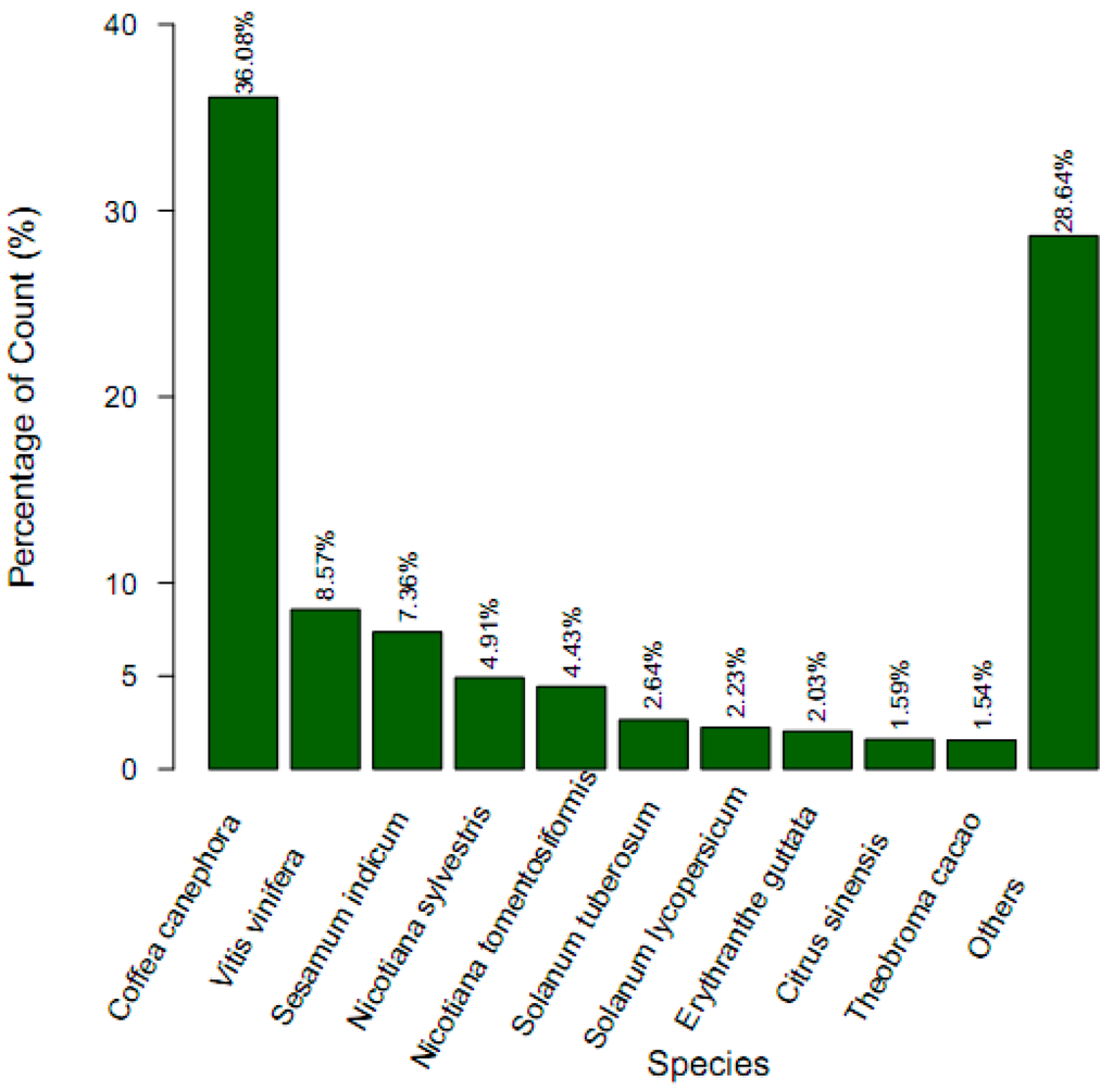 All the 76,717 assembled putative unigenes were aligned using the BLAST program against the NR, NT, Swiss-Prot and COG databases with the E-value cutoff of 10−5. A total of 33,855 unigenes were annotated, accounting for 44.13% (Table 3). Among them, 26,686 unigenes (34.78%) showed high homology, with sequences in the NR database, 24,371 unigenes (31.77%) matched to protein sequences in TAIR10, and 18,627 unigenes (24.28%) showed homology with known genes in SwissProt. The detailed results are shown in Table 3 and Table S1–S3. Based on the top-hit species distribution of the homology result against NR databases, 26,361 unigenes (92.08%) showed high homology with sequences from land plants, among which the highest matches were to genes from Coffea canephora (36.08%), followed by Vitis vinifera (8.57%), and Sesamum indicum (7.36%) (Figure 2).
