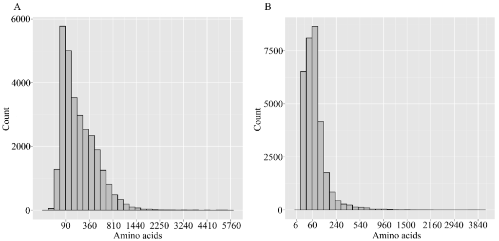 Length distributions of predicated peptides. (A) Predicated by BLAST; (B) Predicated by ESTScan program (Available online: http://www.ch.embnet.org/software/ESTScan.html). The abscissa represents the peptide length, while the ordinate represents thce number of the corresponding number.