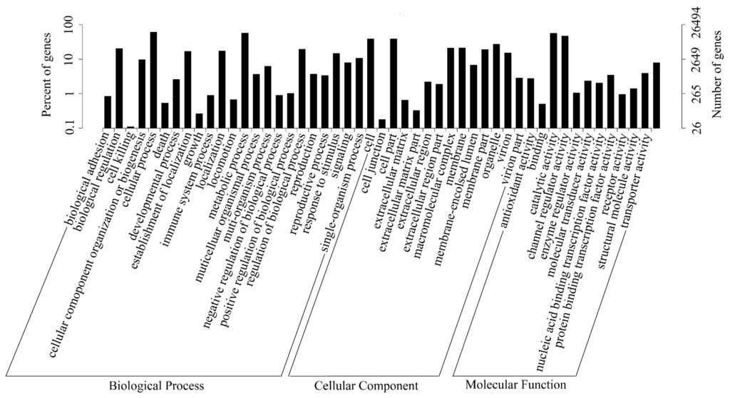 GO classification map. The abscissa represents the next level GO term of the three GO categories, while the ordinate represents the number of genes annotated into the corresponding term, and its proportion of the total number of annotated genes.