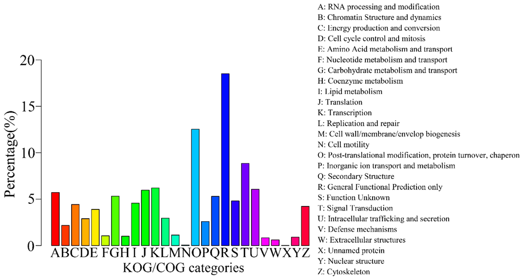 KOG/COG classification map. The abscissa represents 26 group names of KOG/COG, while the vertical axis represents the number of genes annotated into the group and its proportion of total number of annotated genes.