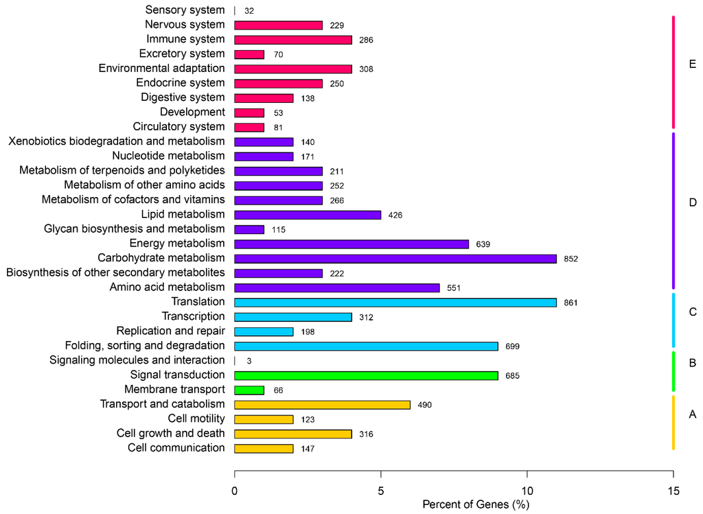 KEGG classification map. The ordinate is the name of the pathway, while the abscissa is the proportion of genes belonging to this pathway. These genes were divided into five branches: (A, Cellular Processes; B, Environmental Information Processing; C, Genetic Information Processing; D, Metabolism; E, Organismal Systems.) according to the metabolic pathway they participated in.