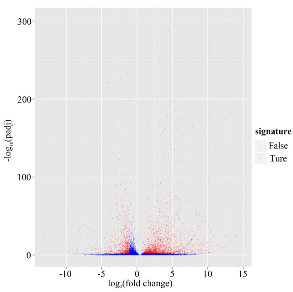 Volcano plot of Leaf ves. Root in G. rigescens. The abscissa represents changes of gene expression (Leaf vs. Root). The ordinate represents the statistical significance of change of the amount of gene expression. The less p-value, the more −log10(p value), and the more significance. The scattering dots represent genes, while the blue dots show genes without significant differences and vice versa for red dots.