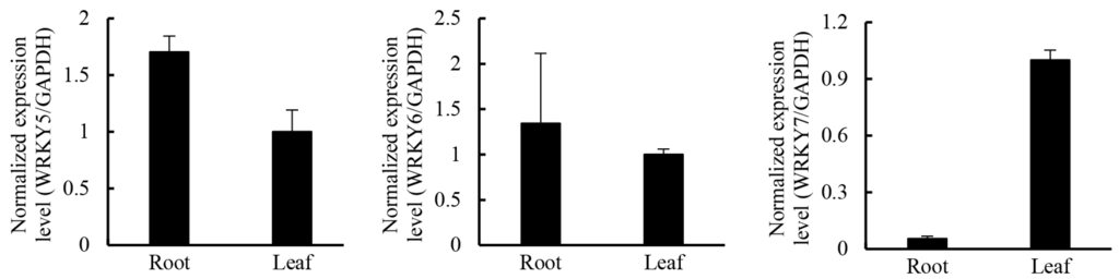 Of the down-regulated genes, a late embryogenesis abundant (LEA) protein, was 13-fold higher in roots than in leaves. Late Embryogenesis Abundant (LEA) proteins are a group of hydrophilic proteins with a high content of glycine, and are associated with stress tolerance in plants and animals through protecting enzymatic function and inhibition of aggregation in dehydration, heat, and salt stress [24,25]. In Arabidopsis thaliana, overexpression of LEA14 enhances salt stress tolerance [26]. Ectopic expression of ZmLEA5C in tobacco and yeast enhances their tolerance to osmotic and low temperature stresses [27]. A calcium-dependent protein kinase (CDPK) gene involved in plant defense responses [28] was nine-fold higher in roots than in leaves. Previous research suggests that CCaMK is an important component of the symbiosis signaling pathway [29,30,31,32,33,34]. In Zea mays, calcium/calmodulin-dependent protein kinase (ZmCCaMK) is required for abscisic acid (ABA)-induced antioxidant defense systems [35]. A high affinity nitrate transporter [36] was eight-fold higher in roots than in leaves. In higher plants, there are two nitrate uptake systems, the high and low affinity transporter systems, and the high affinity nitrate transporter functions when the nitrate concentration is low [37,38].