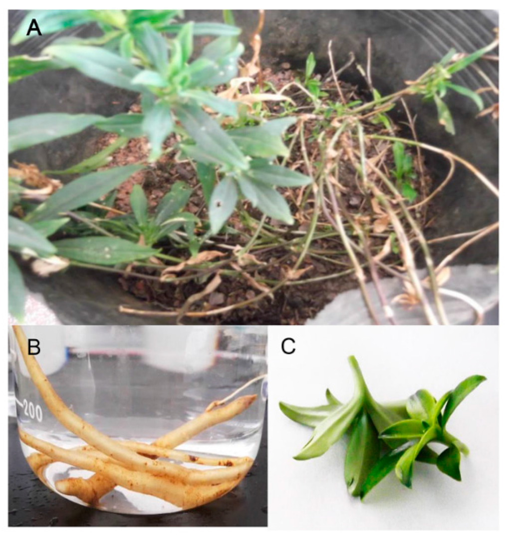 Gentiana rigescens, also named Caine gentian, belongs to Gentiana, a member of the Gentianaceae family. It is a geoherb of great importance to China’s Yunnan province. G. rigescens is a perennial, growing amongst hillside grasses, bushes, and trees, at relatively high altitudes. It is usually harvested in late October, with the roots being used as bulk herbs [1] and raw materials for more than 180 different Chinese traditional medicines [2]. Recent research has shown that it possesses potential functions in liver protection and immune promotion [3,4]. The main effective component of G. rigescens is gentiopicroside [3], which is mainly found in the vacuoles of root cells, although it is synthesized in shoots [5,6]. The content of gentiopicroside in roots was far higher than that in shoots at the flower stage [7]. In addition, there are other active components including swertiamarin, sweroside, erythricine, ursolic acid, oleanolic acid, loganic acid, gentianidine, and gentiana aldin [5,8].