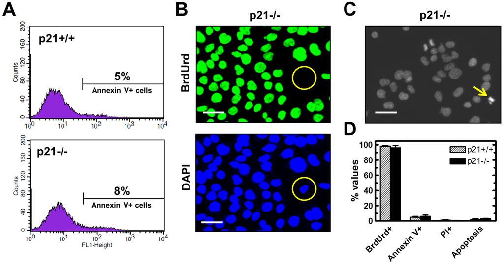 Comparison of HCT116p21+/+ and HCT116p21−/− cultures for apoptosis, viability and proliferation. (A) Flow cytometric evaluation of Annexin V-positive (apoptotic) cells; (B) Evaluation of replicating cells by the BrdUrd immunofluorescence assay. Circles mark a cell that did not exhibit DNA synthesis during the 24-h incubation period with BrdUrd; Scale bar, 20 µm; (C) Representative image of Hoechst 33258-stained HCT116p21−/− cells. The arrow marks a cell with apoptotic morphology; Scale bar, 20 µm; (D) Comparison of these cultures for the indicated parameters. Bars, SE. PI, propidium iodide.