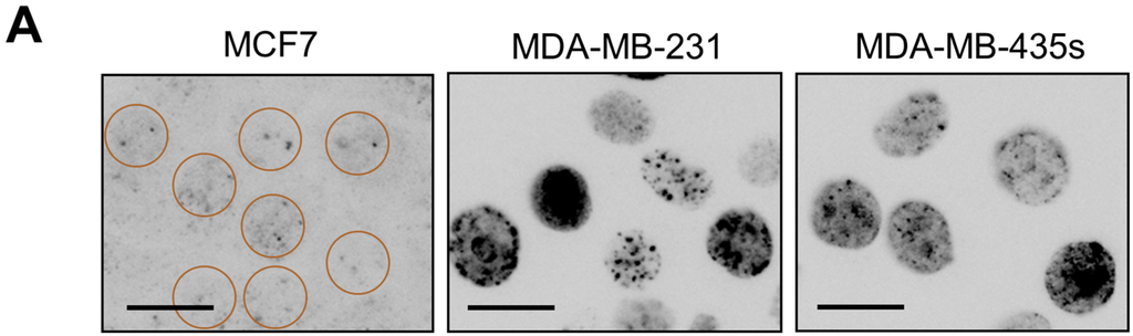 Immunofluorescence microscopy demonstrated the presence of moderate levels (between 3 and 10 per nucleus) or high levels (>10 per nucleus) of γH2AX foci in the majority (>80%) of cells within MDA-MB-231 and MDA-MB-435s cultures, but in only ~5% of cells within MCF7 cultures (Figure 6). The neutral comet assay also showed a higher proportion of cells with DSBs in MDA-MB-231 (~20%) and MDA-MB-435s (~30%) cultures than in MCF7 cultures (<5%) (data not shown). On the other hand, exponentially growing cultures of these three cell lines contained a similar proportion of apoptotic cells (<2%) and proliferating cells (>90%) (Figure 6C), indicating that spontaneous γH2AX foci and DSBs in the MDA-MB-231 and MDA-MB-435s cell lines are not associated with apoptosis.