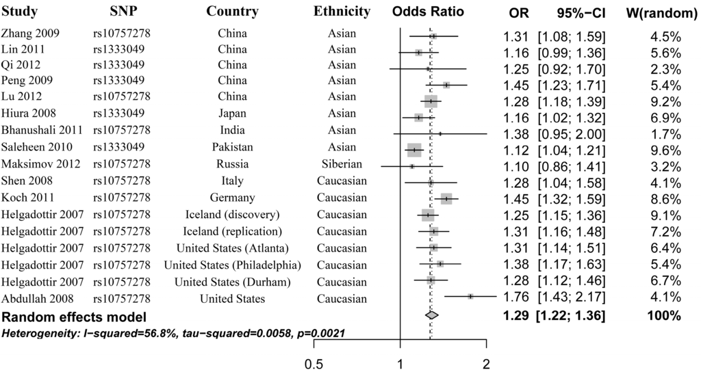 We first evaluated the genetic heterogeneity of rs10757278 polymorphism among the selected studies using additive model. We observed significant heterogeneity with p = 0.0021 and I2 = 56.8%. We calculated the overall OR by the random-effect model. Our results showed significant association between rs10757278 polymorphism and MI with p = 6.09 × 10−22, OR = 1.29, 95% CI 1.22–1.36 (Figure 2).