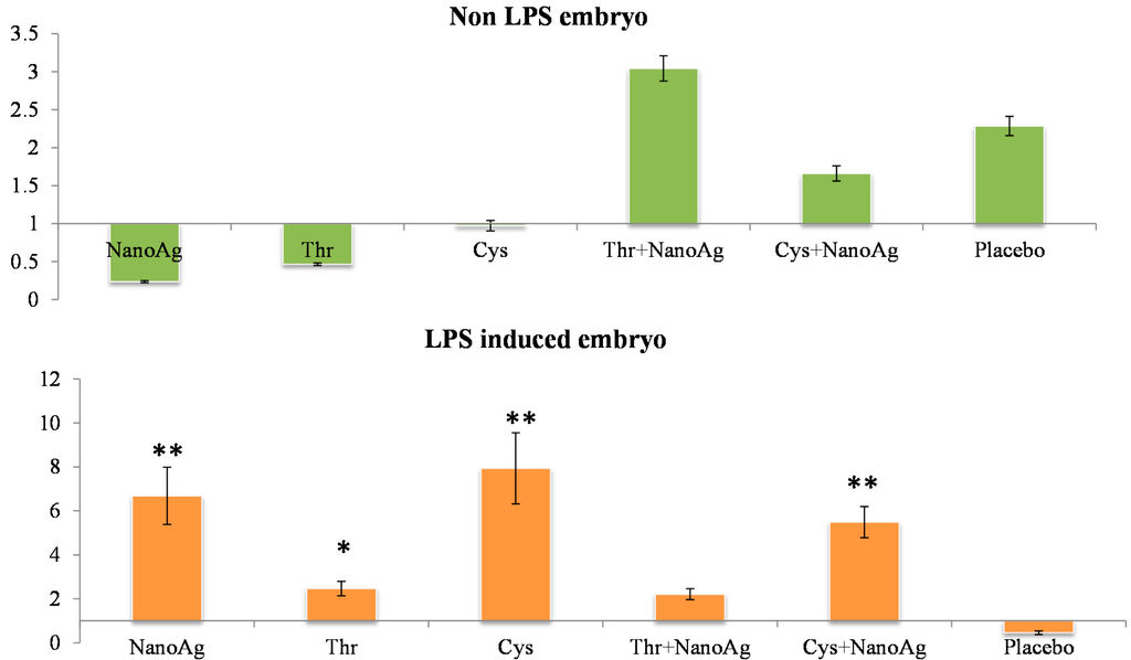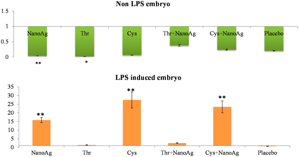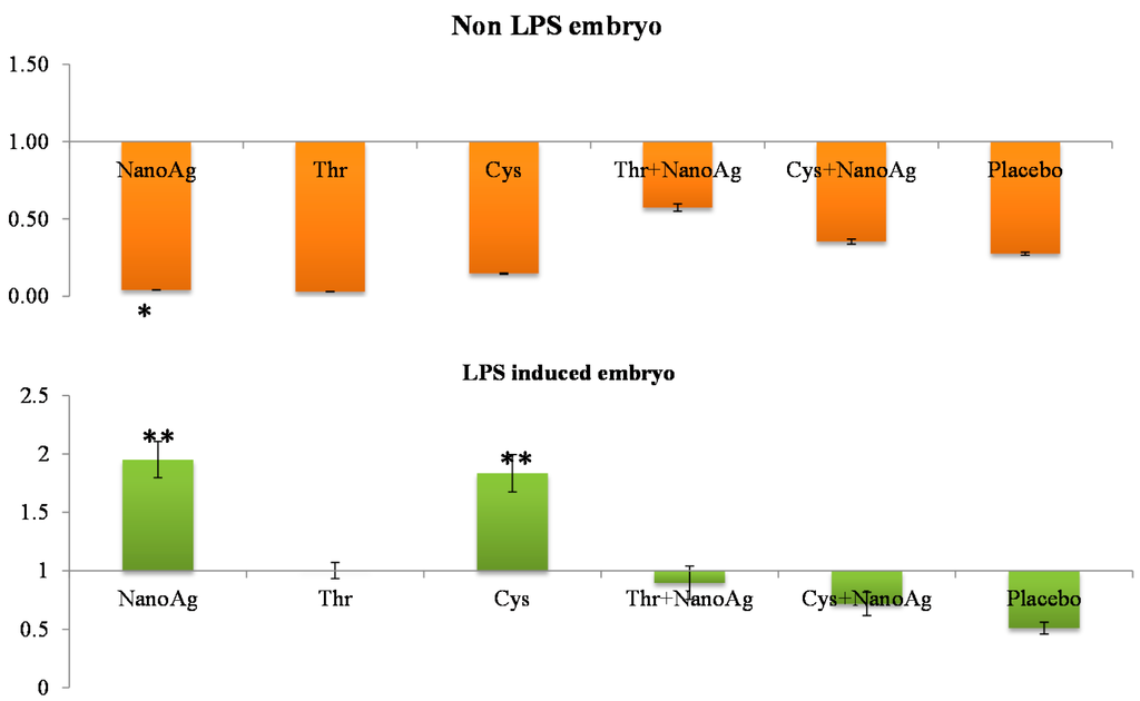 There was significant down-regulation of hepatic IL-6 gene expression in AA and NanoAg injected embryos, but not in the AA+NanoAg groups compared to the uninjected control. However, upon treatment with LPS, the relative gene expression of IL-6 increased in NanoAg (16.7-fold), Cys (29.4-fold) and Cys+NanoAg (25.0-fold) injected embryos but not in Thr or uninjected control embryos (Figure 2).