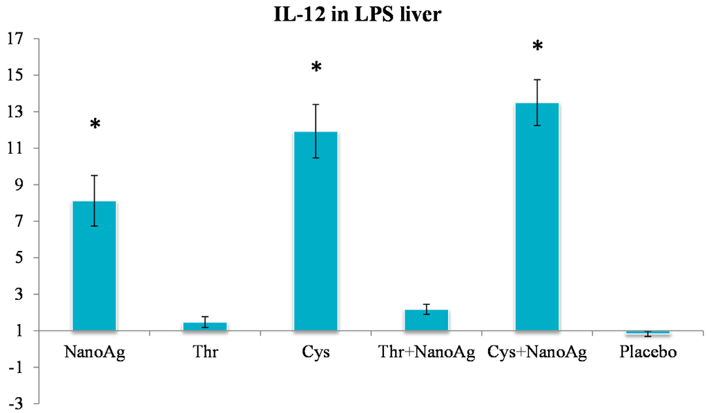 In the non-LPS groups, the expression of TNF-α was not different in AA treated, NanoAg treated and uninjected gene control embryos. Following LPS treatment, TNF-α gene expression increased in NanoAg, Thr, Cys and Cys+NanoAg embryos but not in Thr+NanoAg embryos compared to uninjected control embryos (Figure 3). Significantly higher expression of interleukin-12 (IL-12) was observed in NanoAg, Cys or Cys+NanoAg embryos than in uninjected embryos following LPS treatment (Figure 4).