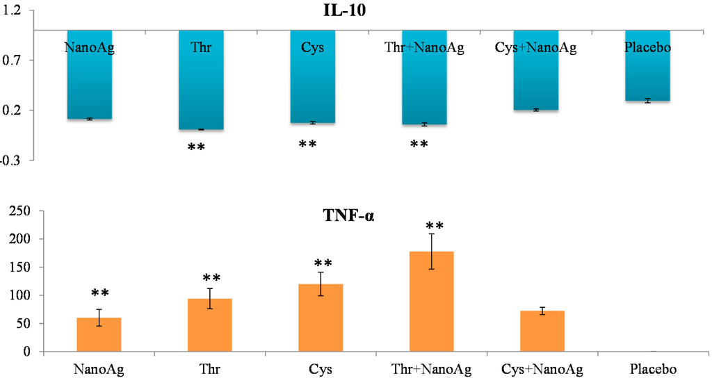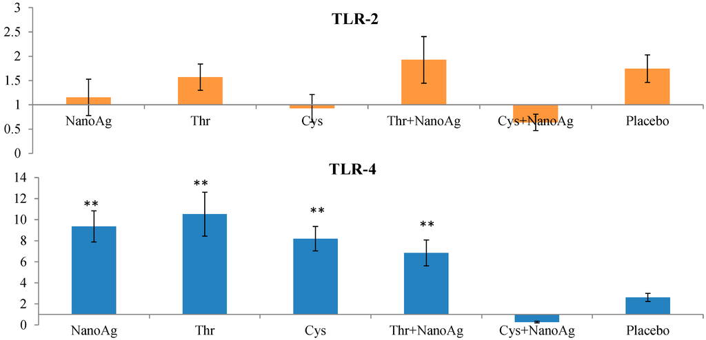 Relative TLR2 expression did not differ between AA, NanoAg or their combinations and the uninjected control group. However, TLR4 expression was significantly (p < 0.05) up-regulated in NanoAg (9.36-fold), Thr (10.53-fold), Cys (8.19-fold) and in Thr+NanoAg (6.85-fold) compared to the placebo and uninjected control groups (Figure 6).