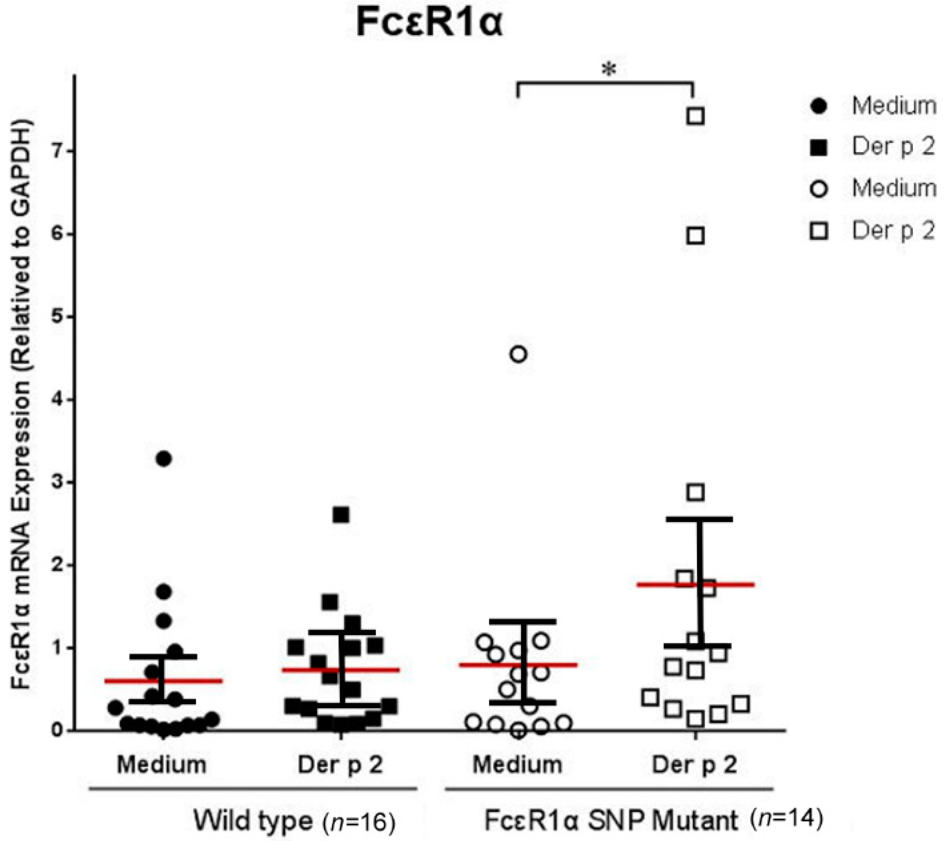 Genetic effect of genotypes rs2251746 (−95, T>C) and rs2427827 (−344, C>T) in the FcεR1α promoter region on FcεR1α mRNA expression. The PBMCs were cultured with or without Der p2 for 48 h, followed by mRNA extraction. Values were presented as mean ± SEM (standard error of mean). There were significantly higher levels of FcεR1α mRNA expression in PBMCs after Der p2 stimulation in subjects with genotypes rs2251746 (−95, T>C) and rs2427827 (−344, C>T) of the FcεR1α promoter region (* p < 0.05). Wild-type: Patients with genotypes of rs2251746 (−95TT) and rs2427827 (−344CC) in FcεR1α promoter region; FcεR1α SNP Mutant: Patients with genotypes of rs2251746 (−95TC) and rs2427827 (−344TT/TC) in the FcεR1α promoter region.