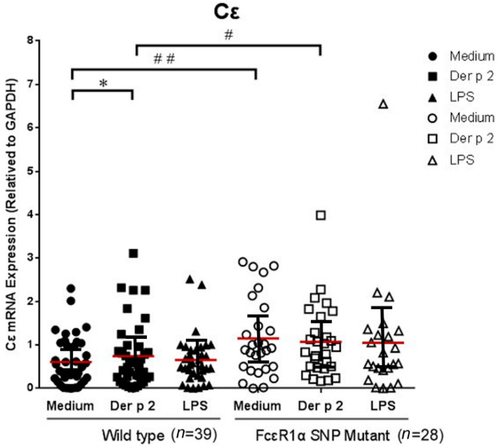 Genetic effect of genotypes rs2251746 (−95, T>C) and rs2427827 (−344, C>T) in the FcεR1α promoter region on Cε mRNA expression. The PBMC were cultured with or without Der p2 for 48 h, followed by mRNA extraction. Values were presented as mean ± SEM. There were significantly higher levels of Cε mRNA expression in the PBMCs of subjects with SNPs of the FcεR1α promoter region, regardless of Der p2 stimulation (* p < 0.05); # p < 0.05 when comparisons between the FcεR1α promoter region SNPs (+) and SNPs (−) under Der p 2 (10 μg/mL) induction; ## p < 0.05 when comparisons between the FcεR1α promoter region SNPs (+) and SNPs (−) under medium condition. The effects of Der p2 on Cε mRNA expression were not affected by SNPs of the FcεR1α promoter region. Wild-type: Patients with genotypes of rs2251746 (−95TT) and rs2427827 (−344CC) in FcεR1α promoter region. FcεR1α SNP Mutant: Patients with genotypes of rs2251746 (−95TC) and rs2427827 (−344TT/TC) in FcεR1α promoter region.