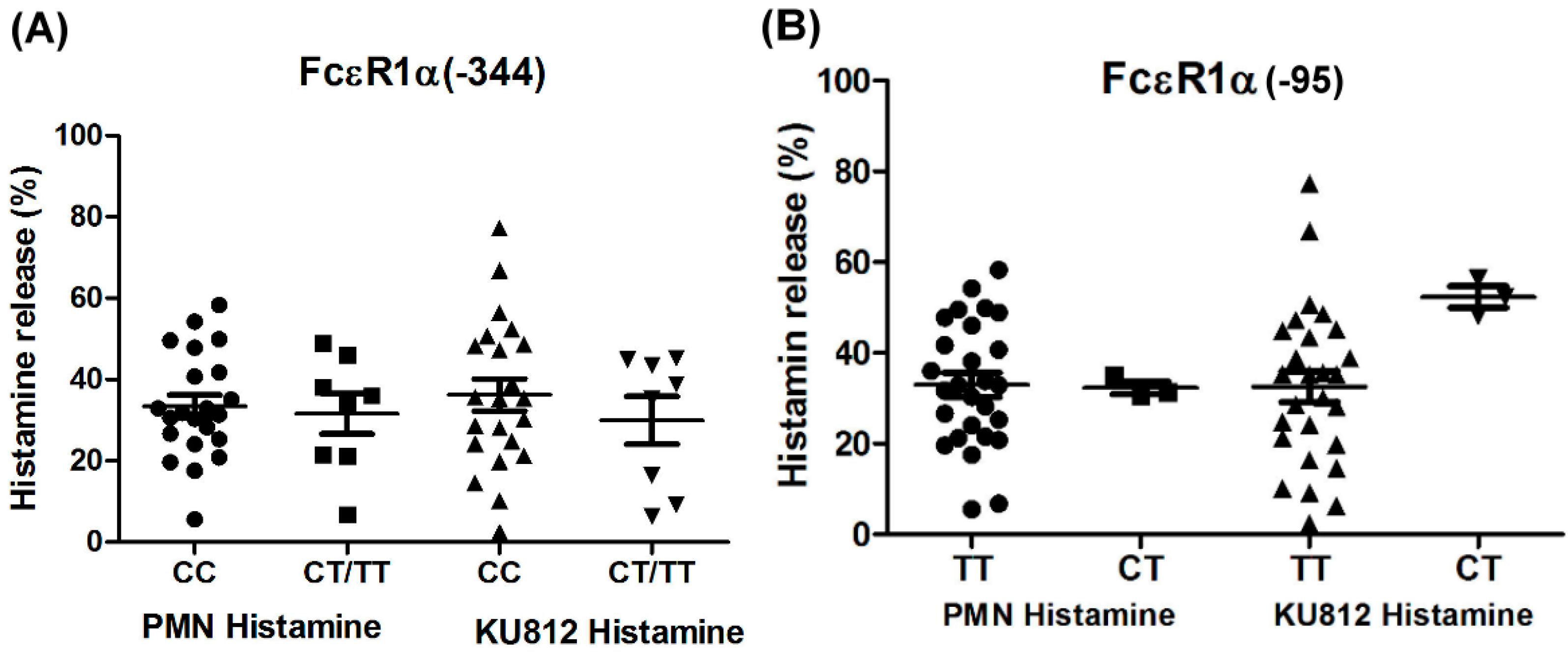 Genetic effect of SNPs of the FcεR1α promoter region on histamine release. The PMNs derived from patients with different FcεR1α promoter SNPs and KU812 cells-presensitized with serum were incubated with Der p2 for 30 min, followed by histamine analysis. Values were presented as mean ± SEM. The results obtained from (A) genotype of FcεR1α (−344CC, CT/TT) and (B) genotype of FcεR1α (−95TT, CT).