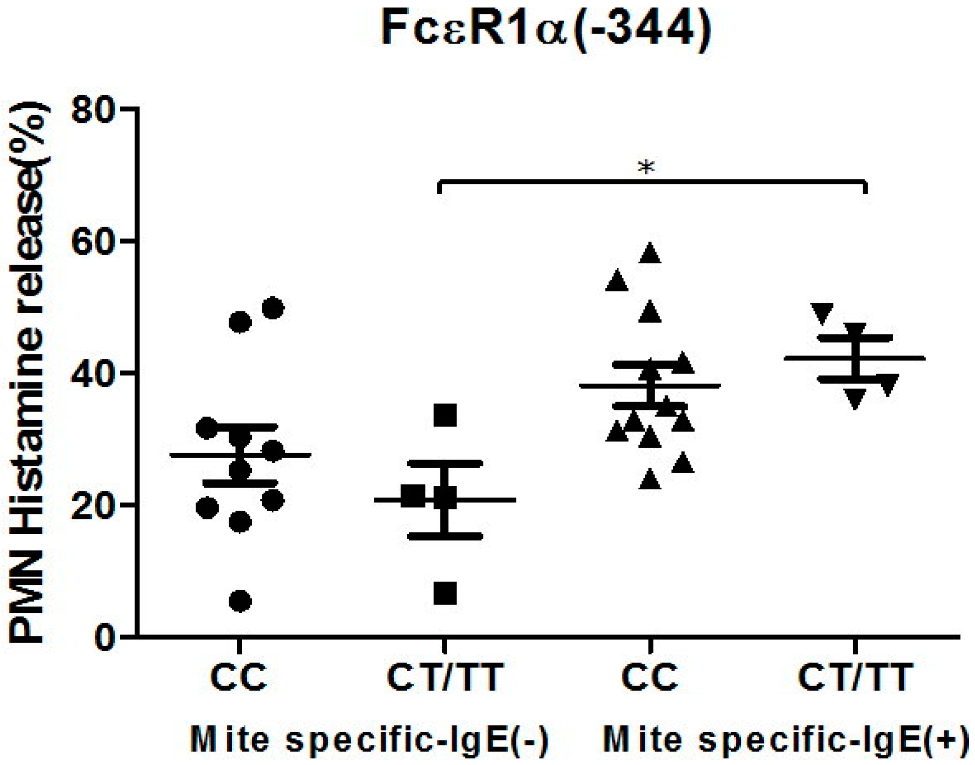 Genetic effect of SNPs of the FcεR1α promoter region (rs2427827, −344) on histamine release. The PMNs derived from patients with different FcεR1α promoter SNPs were incubated with Der p2 for 30 min, followed by histamine analysis. Values were presented as mean ± SEM. PMNs from patients with mite-specific IgE(+) were incubated with Der p2; there was significantly increased histamine release compared to serum derived from mite specific IgE(−); * p < 0.05 significance level when comparisons between two groups.