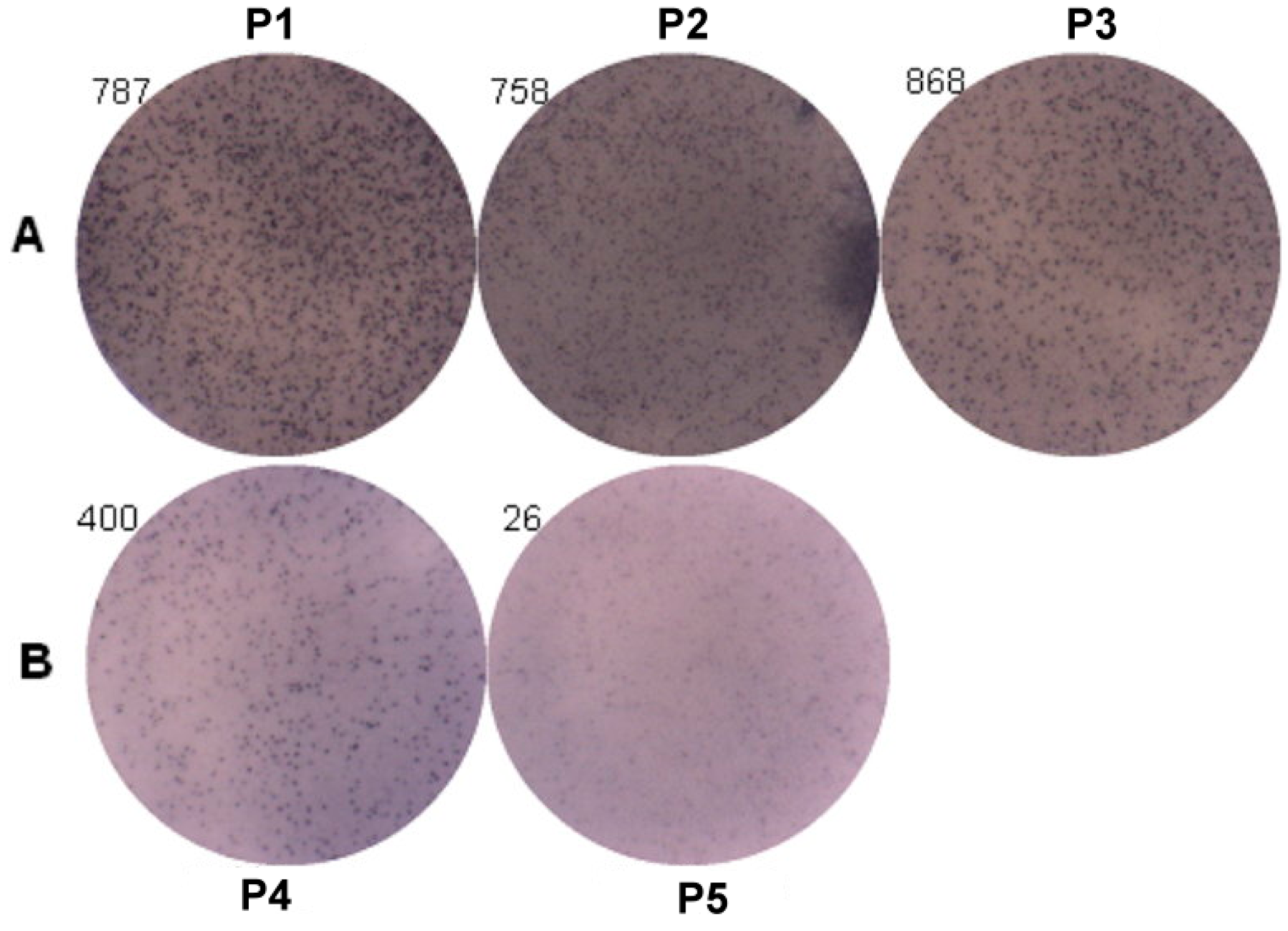 ELISpot assay was used to analyze the IgE producing B cells (Figure 5). The results of three patients with genotypes (P1: −95TC; P2: −344TT; and P3: −344CT) were 787 spots, 758 spots and 868 spots, and two patients with genotypes (P4: −344CC and P5: −95TT) were 400 spots and 26 spots. The IgE producing B cells were higher in those patients with genotypes of rs2251746 (−95TC) and rs2427827 (−344TT/TC) than those with genotypes of rs2251746 (−95TT) and rs2427827 (−344CC) of FcεR1α promoter.