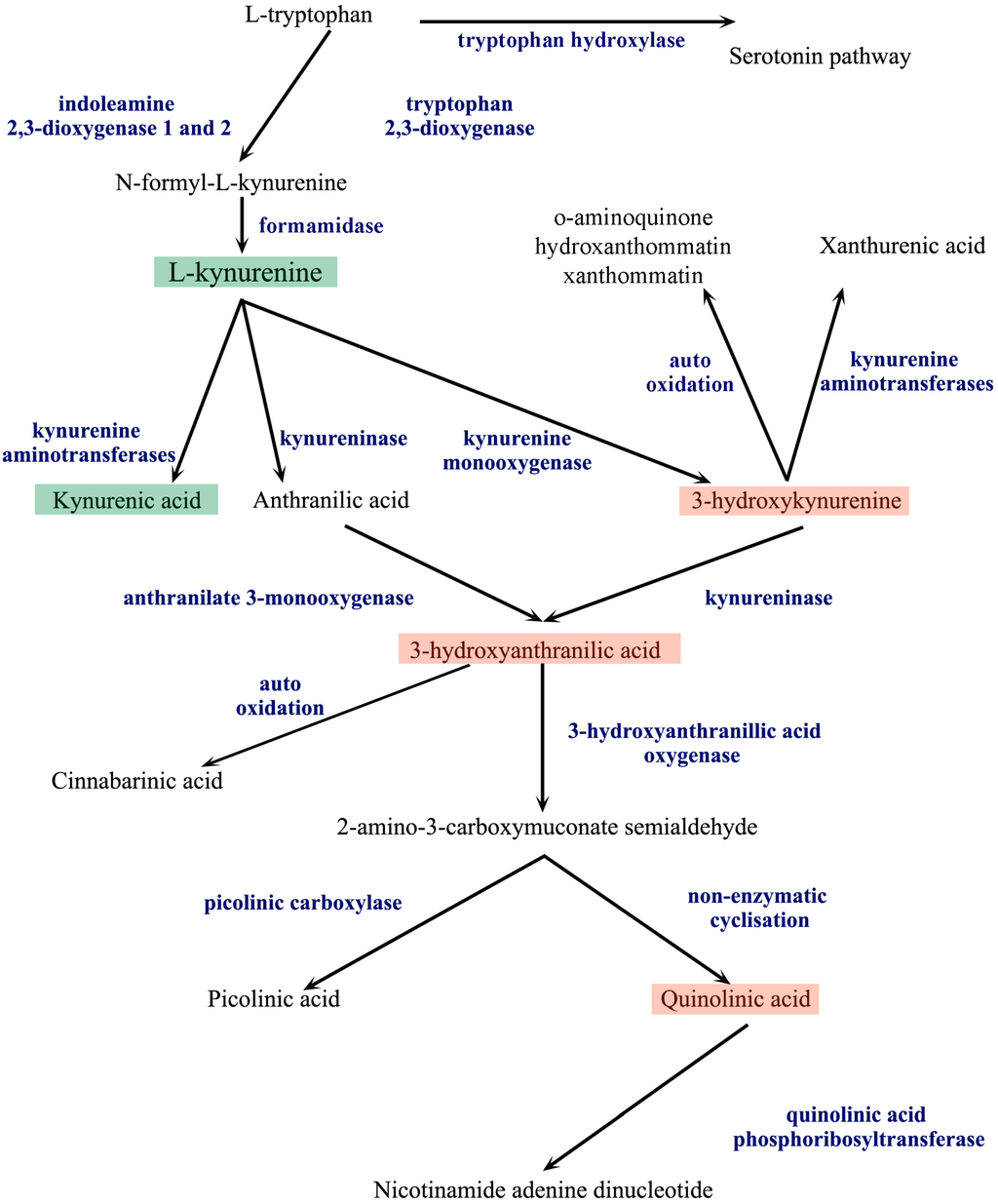 The kynurenine pathway. The metabolism of l-tryptophan is divided into two distinct pathways, the serotonin and the kynurenine pathway (KP). Indoleamine 2,3-dioxygenase 1 and 2 and tryptophan 2,3-dioxygenase convert l-tryptophan to N-formyl-l-kynurenine in the first step of the KP. N-formyl-l-kynurenine is further processed by formamidase to l-kynurenine (l-KYN), the central metabolite of the KP. From l-KYN, three different enzymes produce the next metabolites, forming three branches of the metabolism. The first branch is the kynurenic acid branch, where kynurenine aminotransferases (KATs) produce kynurenic acid from l-KYN. On the second branch, kynureninase converts l-KYN to anthranilic acid, which is further metabolized by anthranilate 3-monoxygenase to 3-hydroxyanthranilic acid (3-HA). On the third branch, kynurenine monooxygenase produces 3-hydroxykynurenine (3-HK), which is further metabolized by kynureninase to 3-HA. 3-HK can be also metabolized by KATs to form xanthurenic acid or be auto-oxidized. 3-HA is converted by 3-hydroxyanthranilic acid oxygenase to 2-amino-3-carboxymuconate semialdehyde or suffers auto-oxidation to form cinnabarinic acid. 2-amino-3-carboxymuconate semialdehyde can be converted by picolinic carboxylase to picolinic acid or can be converted by non-enzymatic cyclisation to quinolinic acid, which, through conversion by quinolinic acid phosphoribosyltransferase, results in the formation of nicotinamide adenine dinucleotide.