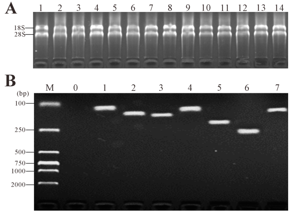 Agarose gel electrophoresis of total RNA and PCR amplification of the candidate reference genes and target gene using synthesized cDNA as templates. (A) Total RNA extracted from the spleen at 0w (the zero day before vaccination), 1w (1 week post-vaccination, the same below), 2w, 3w, 4w, C24h (24 h post-challenge), C2w (2 weeks post-challenge) of rSip group (Lanes 1–7) and PBS group (Lanes 8–14) were fractioned on agarose gel 2%, which showed intact 28S and 18S rRNAs were evident without any other higher molecular weight molecules; (B) PCR amplification of the candidate reference genes and target gene using synthesized cDNA as templates, which revealed that the specific primer for each candidate reference gene and target gene amplified a specific product consistent with the expected size on cDNA templates. M: DNA marker DL2000. Lane 0: negative control. Lane 1–7: 18S rRNA, ACTB, TUBA, UBCE, GAPDH, EF1A, IgM, respectively.
