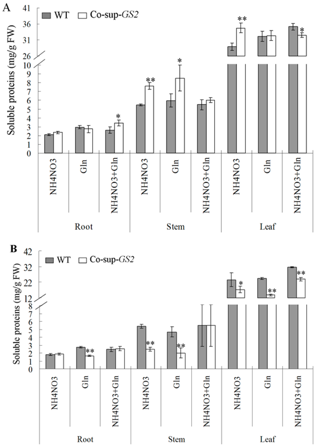 The concentration of soluble proteins in the roots, stems and uppermost leaves of GS2-cosuppressed plants (Co-sup-GS2) and wild-type plants (WT) at the seedling stage (A) and the tillering stage (B) under N (NH4NO3), G (Gln) and N + G (NH4NO3 + Gln) conditions. Values are the mean ± SD from three biological replicated plant materials. *, ** Significant differences at the level of p = 0.05 and p = 0.01, respectively.