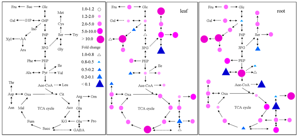 The fold change corresponds to the ratio of the concentration of individual metabolites involved in carbon and nitrogen metabolism in the GS2-cosuppressed plants relative to the wild-type plants for the uppermost leaves and roots at the tillering stage under N condition. Red dots indicate increased metabolites, and blue triangles indicate decreased metabolites. Glc, glucose; Suc, sucrose; Fru, fructose; F6P, frutose-6-P; G6P, glucose-6-P; G1P, glucose-1-P; Gal, galactose; Ino, inositol; AA, ascorbic acid; Ara, arabinose; Xyl, xylitol; 3PG, 3-P-glycerate; PEP, phosphoenolpyruvate; Pyr, pyruvate; Ace-CoA, acetyl-CoA; Cit, citrate; Aco, aconitase; KG, ketoglutarate; Succ, succinate; Fum, fumarate; Mal, malate; Oxa, oxaloacetate; Glu, glutamate; Gln, glutamine; Arg, arginine; Pro, proline; Orn, ornithine; GABA, aminobutyric; Asp, aspartate; Asn, asparagine; Ile, isoleucine; Met, methionine; Thr, threonine; Ala, alanine; Val, valine; Leu, leucine; Phe, phenylalanine; Try, tryptophan; Ser, serine; Gly, glycine; Cys, cysteine.