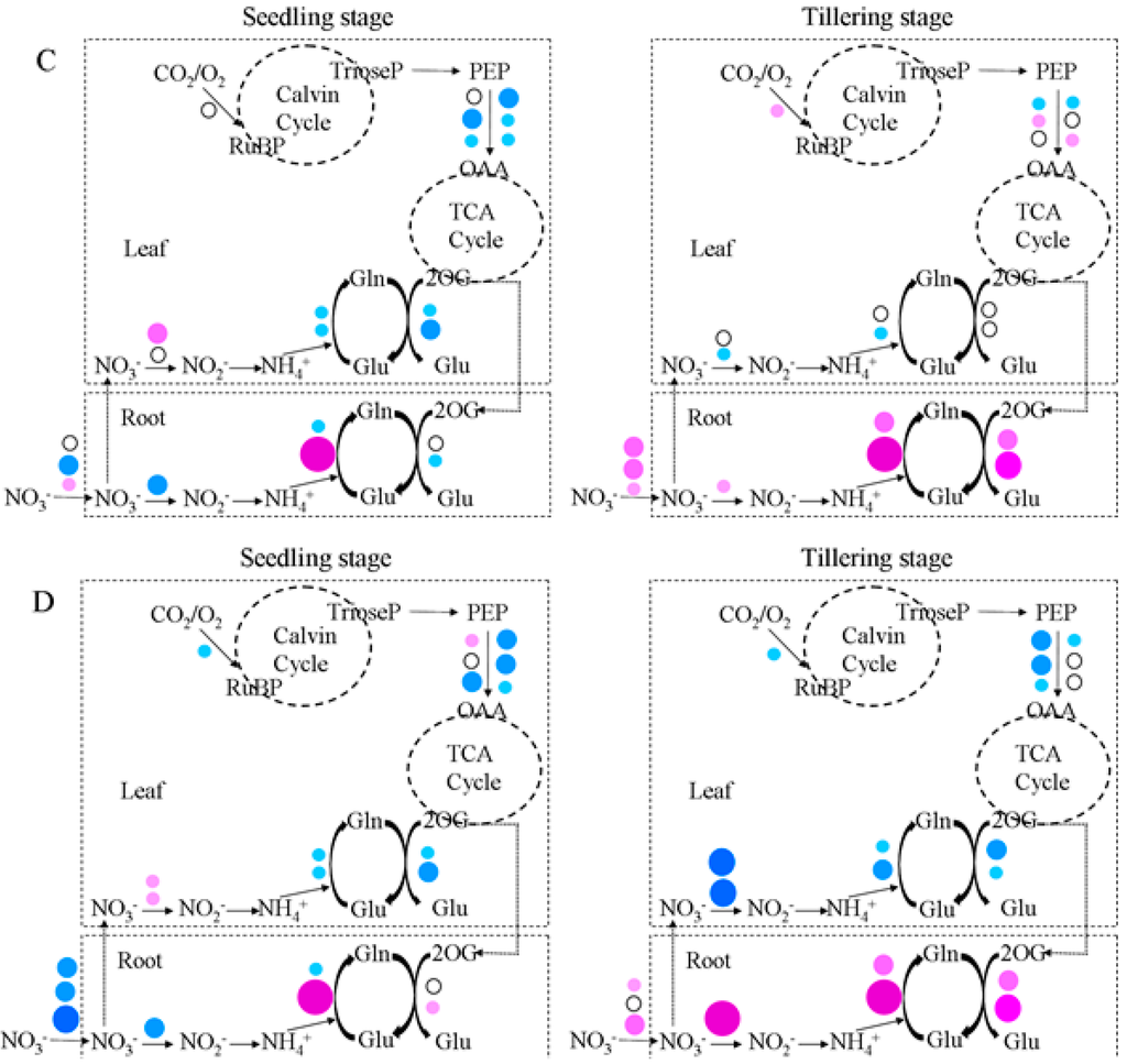 In this study, we systematically analyzed the differences in the growth phenotype, carbon-nitrogen metabolic status and gene expression profile between GS2-cosuppressed rice and wild-type Zhonghua 11 at both the seedling stage and the tillering stage under three different nitrogen conditions (N, G and N + G). Results demonstrated the close relationships between the GS2 mRNA levels and carbon-nitrogen metabolic status, as well as the plant growth phenotype. Figure 7 summarizes the differences between the seedling stage and the tillering stage in the GS2 transgenic plants.