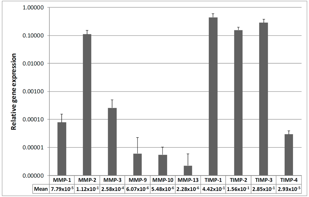 MMP and TIMP mRNA expression of all samples. Quantitative Real-Time PCR (qRT-PCR) analysis from torn RC tendons. The data represent the relative gene expression with 18S as reference gene using the ΔCt method with efficiency correction. Data are expressed as the mean ± SD (n = 30) given in logarithmic form. MMP-2, TIMP-1, -2, and -3 showed the highest expression levels, while MMP-9, -10, and -13 showed lowest expression.