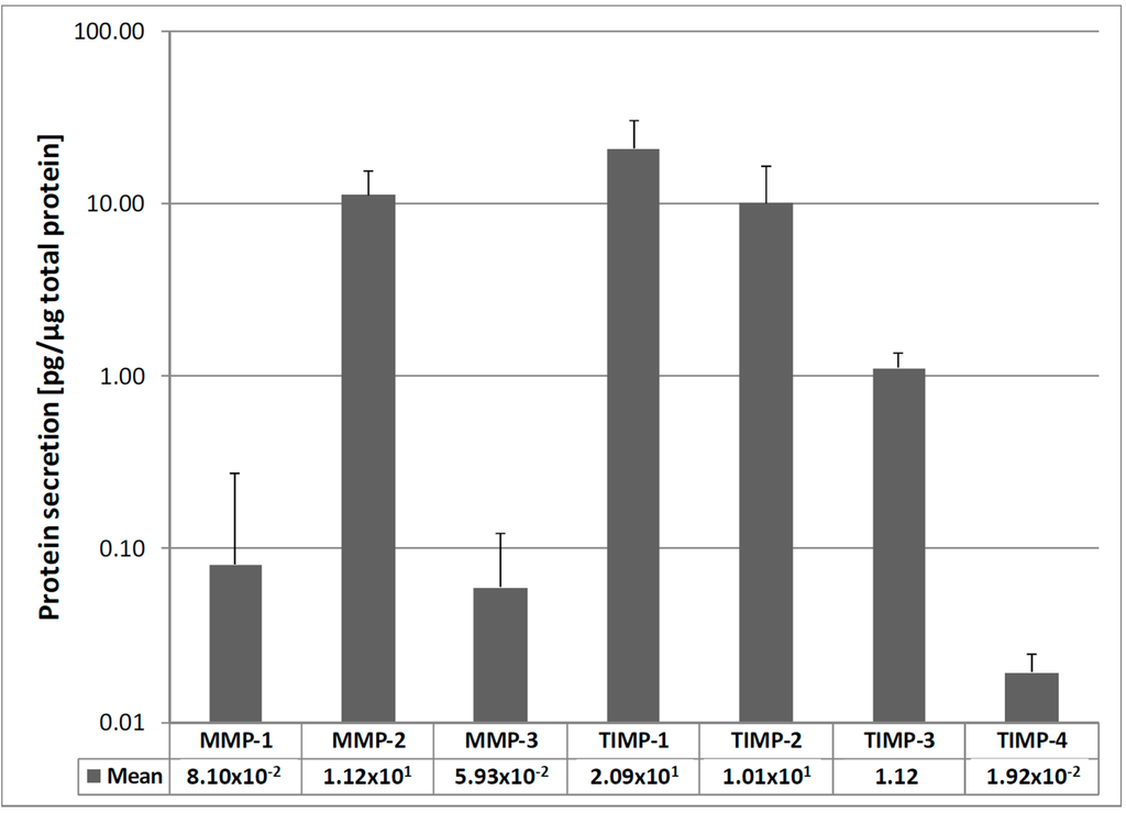 MMP and TIMP protein secretion of all samples. MMP-2 and TIMP-1 data were derived from sandwich ELISA. All other proteins were analyzed using Multiplex ELISA technique. All values were normalized to the total protein content (Coomassie Plus assay), given as mean ± SD (n = 30) represented in a logarithmic graph. MMP-2, TIMP-1, and -2 protein secretion was strongest in the cells, while MMP-1, -3, and TIMP-4 protein secretion was lower.