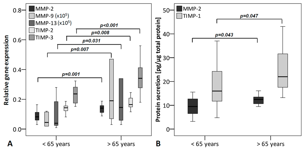 MMPs and TIMPs grouped according to the age of the donors (under 65 years (n = 16) and over 65 years (n = 14)). (A) qRT-PCR was performed to analyze gene expression. The box plot data represent the relative gene expression with 18S as reference gene using the ΔCt method with efficiency correction. The mRNA levels of MMP-2, -9, -13 and TIMP-2, -3 are significantly increased with higher age; (B) Protein levels were analyzed using ELISA and normalized to total protein content (Coomassie Plus assay). Protein levels of MMP-2 and TIMP-1 were significantly elevated with higher age. To allow visualization of all MMPs/TIMPs in one figure, MMP-9 and -13 values were multiplied by 105.