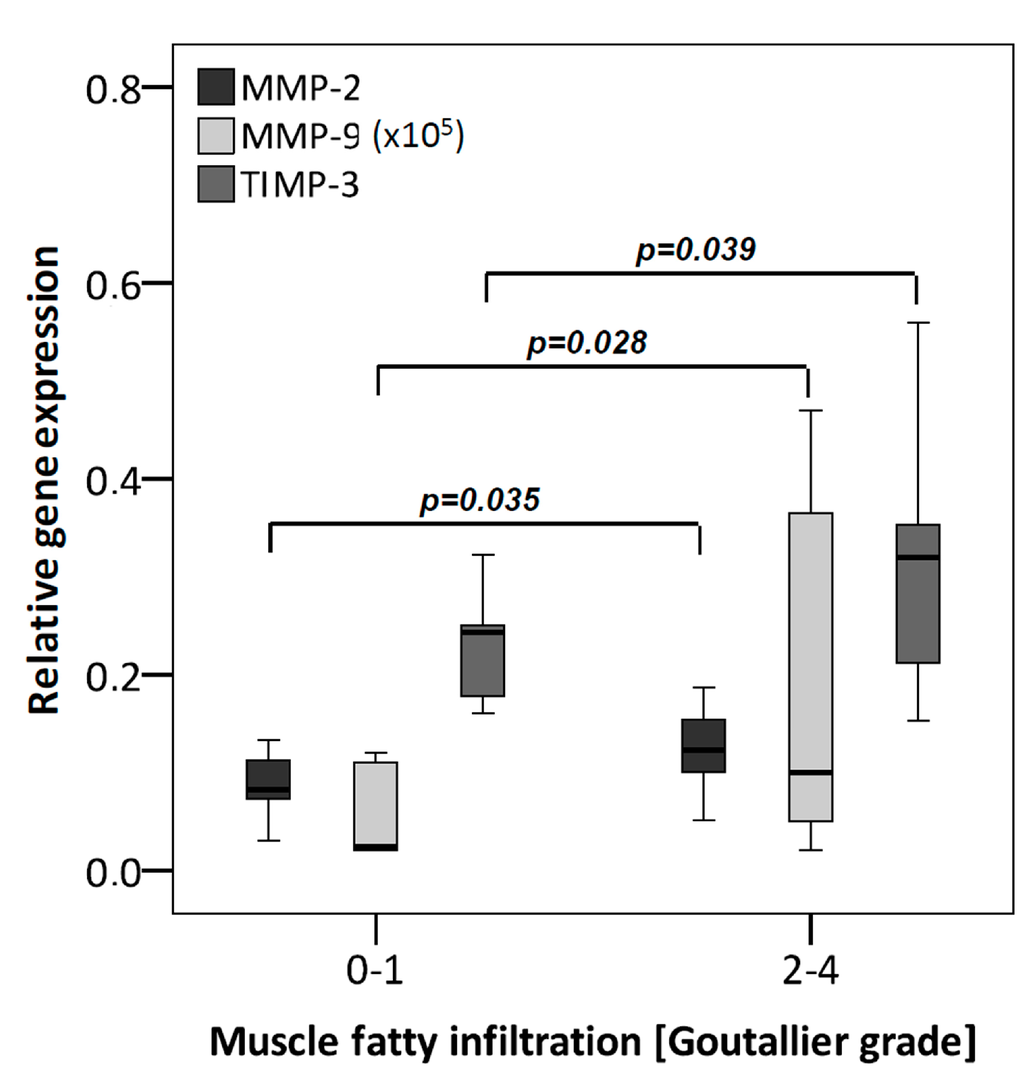 MMPs and TIMPs grouped according to the MFI (low MFI: Goutallier score 0–1 (n = 10); high MFI: Goutallier score 2–4 (n = 20)). qRT-PCR was performed to analyze gene expression. The box plot data represent the relative gene expression with 18S as reference gene using the ΔCt method with efficiency correction. In the high MFI group increasing gene expression for MMP-2, -9 and TIMP-3 occurred. To allow a visualization of all MMPs/TIMPs in one figure, MMP-9 values were multiplied by 105.