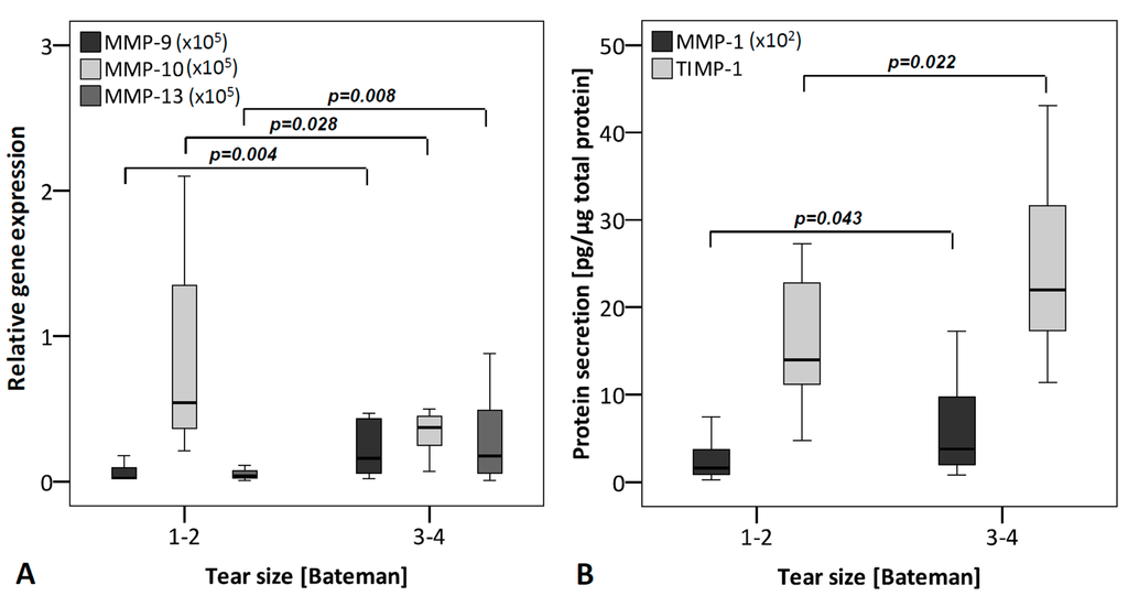 MMPs and TIMPs grouped according to the tear size (small tear size: Bateman score 1–2 (n = 12); big tear size: Bateman score 3–4 (n = 18)). (A) qRT-PCR was performed to analyze gene expression. The box plot data represent the relative gene expression with 18S as reference gene using the ΔCt method with efficiency correction. MMP-9, and -13 expression of donors with bigger tear size was significantly increased, while MMP-10 expression was decreased at mRNA level; and (B) Protein levels were analyzed using ELISA and normalized to total protein content (Coomassie Plus assay). Protein level of MMP-1 and TIMP-1 showed an elevated secretion with bigger tear size. To allow a visualization of all MMPs/TIMPs in one figure, MMP-1 values were multiplied by 102 and MMP-9, -10 and -13 by 105.