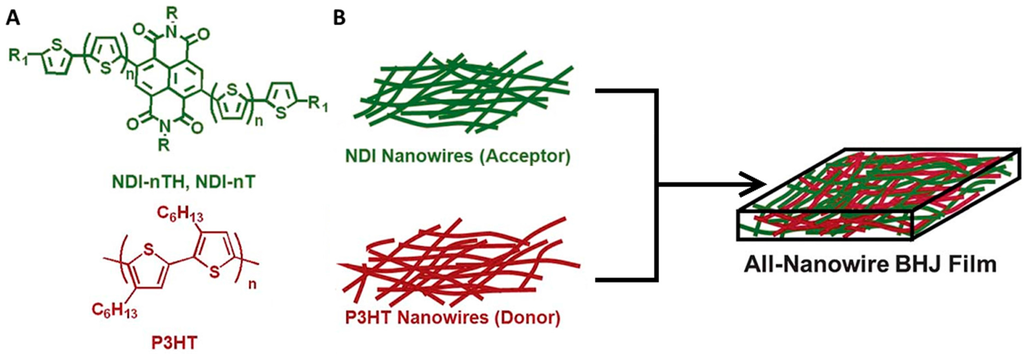 - Ren, G.; Ahmed, E.; Jenekhe, S.A. Nanowires of oligothiophene-functionalized naphthalene diimides: Self assembly, morphology, and all-nanowire bulk heterojunction solar cells. J. Mater. Chem. 2012, 22, 24373–24379. [Google Scholar] [CrossRef]