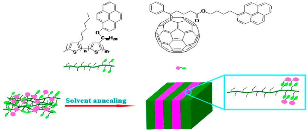 - Chen, L.; Peng, S.; Chen, Y. Cooperative assembly of pyrene-functionalized donor/acceptor blend for ordered nanomorphology by intermolecular noncovalent π–π interactions. ACS Appl. Mater. Interfaces 2014, 6, 8115–8123. [Google Scholar] [CrossRef] [PubMed]