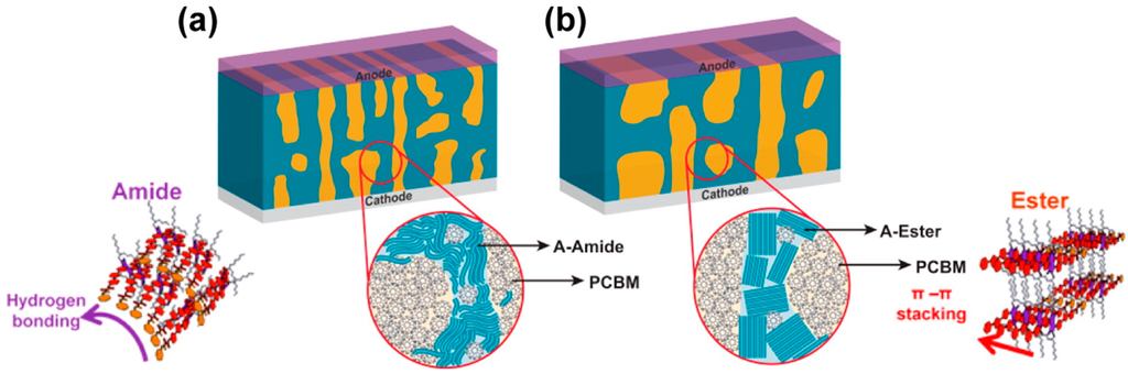 - Aytun, T.; Barreda, L.; Ruiz-Carretero, A.; Lehrman, J.A.; Stupp, S.I. Improving solar cell efficiency through hydrogen bonding: A method for tuning active layer morphology. Chem. Mater. 2015, 27, 1201–1209. [Google Scholar] [CrossRef]