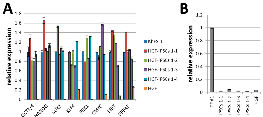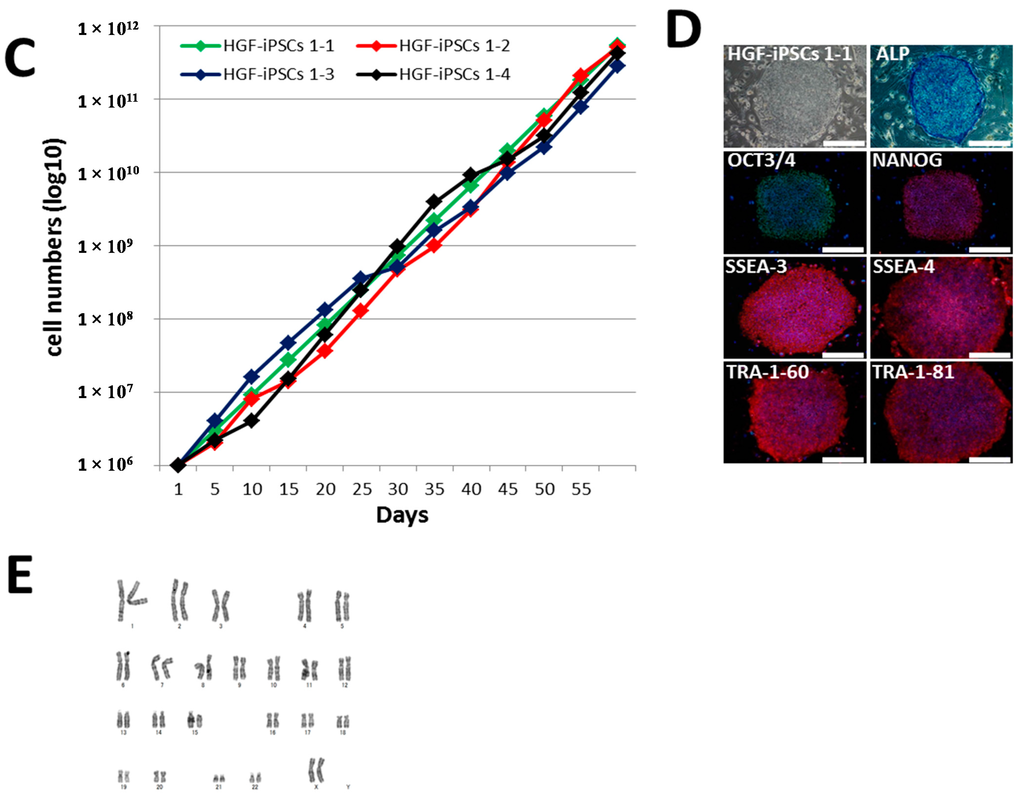 Rohani et al. have reported that reprogramming efficiency declines with age []. The generation of iPSCs from elder donors was essential for future autologous cell therapies. Therefore, clones were selected from the eldest Asian female donor (70-year-old; HGF1). Four HGF-iPSCs were selected for characterization among all picked clones after 20 passages, based on their higher proliferation and stability of the ES-like morphology. HGF-iPSCs 1-1 were selected for the main figures as representative of the four lines. An expression analysis of ESC-specific and integration markers in HGF-iPSCs 1-1, 1-2, 1-3, and 1-4 was conducted using qRT-PCR. ESC-specific markers used were OCT3/4, NANOG, SOX2, KLF4, REX1, DPPA5, and hTERT, and all were expressed at similar levels than that of the ES cell line, KhES-1 (Figure 1A). Specific primers displayed the presence of the episomal vector component oriP. HGFs, as a negative control, did not display oriP, but as a positive control, HGFs day 1 after transfection (TF d1) did []. In contrast, no oriP was detected in any HGF-iPSCs after 20 passages (Figure 1B). These four HGF-iPSCs had not integrated the plasmids into a chromosome. These data demonstrated that the episomal vectors were spontaneously lost in the majority of HGF-iPSCs. These HGF-iPSC clones could be maintained beyond 50 passages and demonstrated ES cell-like morphology and proliferation (Figure 1C). They expressed ESC-specific surface markers, such as OCT3/4, NANOG, SSEA-3, SSEA-4, TRA-1-60, TRA-1-81, and alkaline phosphatase (Figure 1D and Figure S1). A karyotype analysis showed a normal human karyotype for all tested clones (Figure 1E and Figure S2).