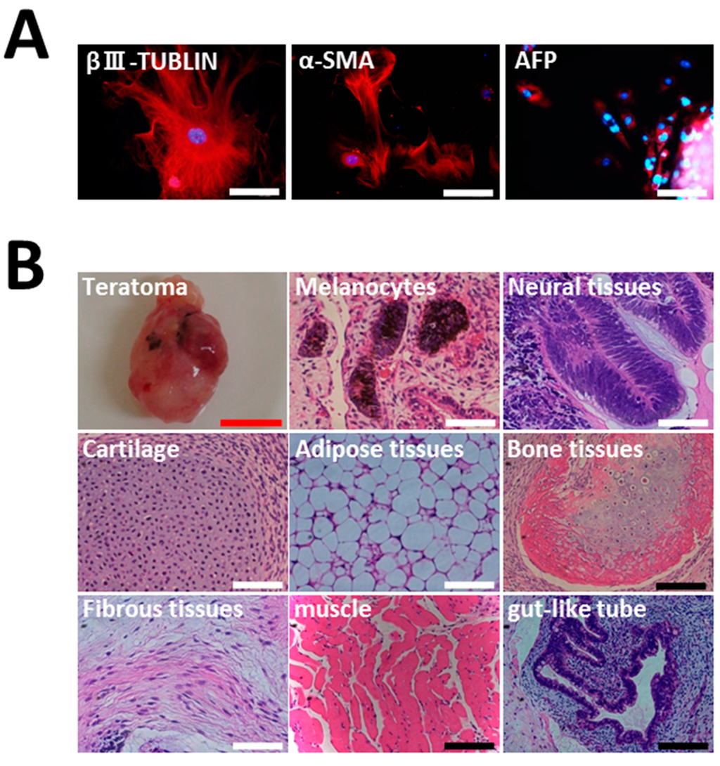 Induced PSCs have the potential to differentiate into three germ layers in vitro and in vivo. (A) Immunocytochemistry for β-III tubulin, α-smooth muscle actin (α-SMA), α-fetoprotein (AFP) for the differentiation capacity of HGF-iPSCs 1-1 at passage 37 into embryoid bodies; (B) Hematoxylin and eosin staining of teratoma derived from iPSCs 1-1 at passage 36 and observation of neural tissue (ectoderm), melanocytes (ectoderm), cartilage (mesoderm), adipose tissue (mesoderm), bone tissue (mesoderm), fibrous tissue (mesoderm), muscle (mesoderm), and gut-like tube (endoderm). White scale bar = 200 μm, red scale bar = 10 mm, black scale bar = 400 mm.