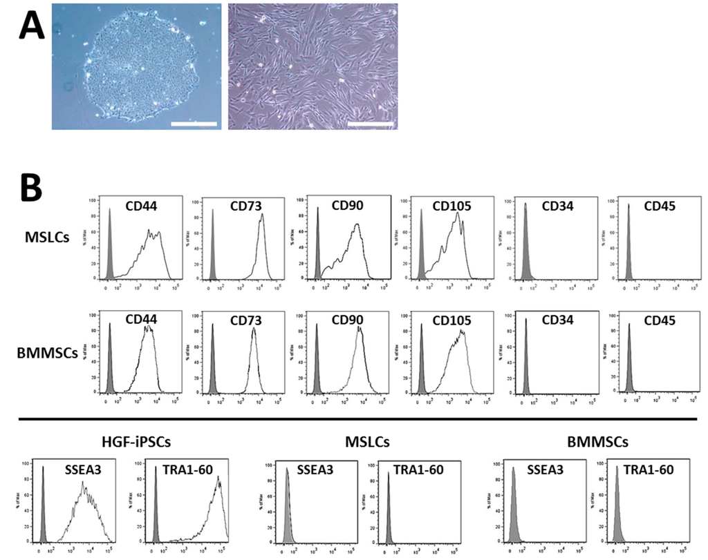 Characterization of MSC-like cells generated from iPSCs. (A) Morphology of HGF-iPSCs 1-1 at passage 45 cultured on GFRM with mTeSR1 (left). Morphology of MSC-like cells from HGF-iPSCs 1-1 differentiated (MSLCs 1-1) at passage 4 (right); (B) Flow cytometry analysis of MSC-related surface markers (CD44, CD73, CD90, and CD105), hematopoietic markers (CD34 and CD45), and pluripotent markers (SSEA3 and TRA1-60) on MSLCs 1-1 at passage 10. BMMSCs were used (passage 5) as positive control and HGF-iPSCs 1-1 (passage 45) as negative control; (C) MSC-like cells from HGF-iPSCs 1-2 (MSLCs 1-2) were differentiated at passage 23. Growth curve of BMMSCs, MSLCs 1-1 and 1-2. Scale bar = 400 μm. GFRM, Growth factor-reduced Matrigel.