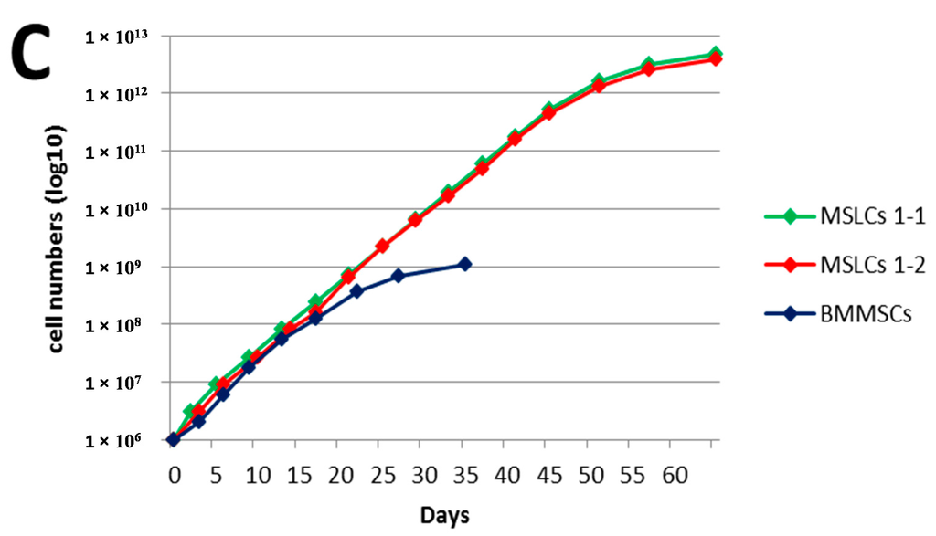 Recently, many groups have successfully established MSC-like cells (MSLCs) from ES/iPSCs [,,,,]. Lian et al. [] demonstrated that these cells exhibited a greater proliferative capacity than primary cultures of bone marrow-derived MSCs [,]. Moreover, they might not have a tumorigenic potential, making them safer for implantation into humans [].