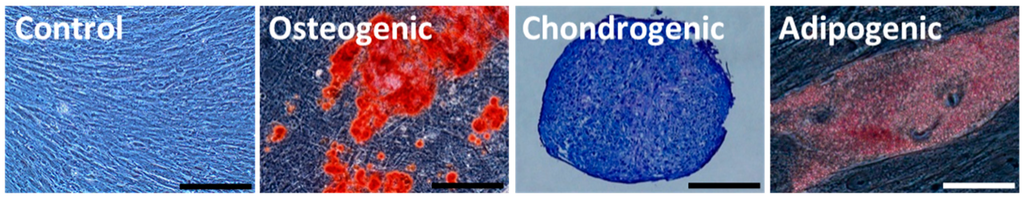 Trilineage differentiation was carried out as previously described []. Osteogenic differentiation induction was performed in the following medium: DMEM-high glucose (Invitrogen) supplemented with 10% FBS (Gibco), 290 nM ascorbic acid-2-phosphate (Merck, Hessen, Germany), 5 mM β-glycerophosphate (Sigma), and 100 nM dexamethasone (Sigma). Adipogenic differentiation induction was performed in the following medium: DMEM-high glucose (Invitrogen) supplemented with 15% Horse Serum (SIGMA), and 100 nM dexamethasone (Sigma). Chondrogenic differentiation induction was performed as follows: Cells were collected in a 1.5 mL tube by centrifugation and differentiated in a medium of DMEM-high glucose (Invitrogen), supplemented with 50 mg/mL ascorbic acid, 100 nM dexamethasone, 1:100 ITS premix (BD Biosciences, San Jose, CA, USA), 40 μg/mL l-proline (Sigma-Aldrich), and 10 ng/mL human recombinant TGFβ3 (PeproTech). During all differentiation inductions, the medium was changed every 3 days, and the differentiation evaluated after 21 days by alizarin red staining, oil red staining, and toluidine blue staining [].