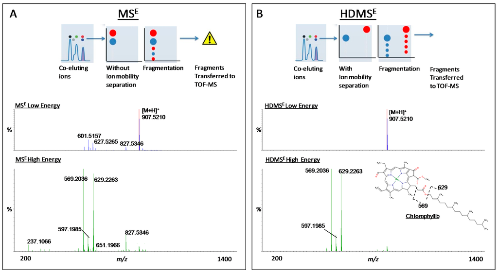 Representative MSE (A) and HDMSE (B) acquisitions of both precursors and fragment spectra information along one single chromatographic run. Applying high collision energy in the transfer collision cell, precursor molecules can be broken down into constituent parts (product ions), to deduce the original structure (bottom panel). To help identify complex mixtures of metabolites, the identification of the chlorophyll b structure was based on the observation of characteristic fragments generated with high energy after ion-mobility separation using (HDMSE). The inclusion of an ion-mobility separation of co-eluting precursor metabolites by HDMSE produced cleaner product ion spectra compared to MSE, which facilitated the identification of chlorophyll b by searching against databases and previously published results [].