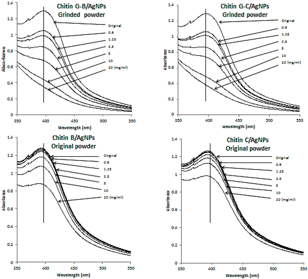 UV-Vis spectra from Ag NPs in suspension and supernatants of post-reaction mixtures showed variations in the amounts of chitin that reacted with Ag NPs. Moreover, a peak at 390.5 nm was representative of the spherical Ag NPs used in this work (Figure 3) [26], and the amounts of Ag NPs remaining in supernatants of post-reaction mixtures decreased with increasing concentrations of chitin. Thus, Ag NPs showed selective reactions with chitins G-B, G-C, and chitin A, and limited reactions with chitins B and C [28].