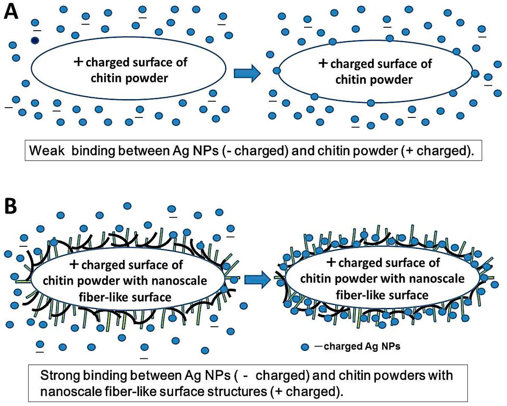 Scheme on adsorption of Ag NPs onto chitin with flat/smooth film-like surface structures (A) with nanoscale fiber-like surface structures (B).