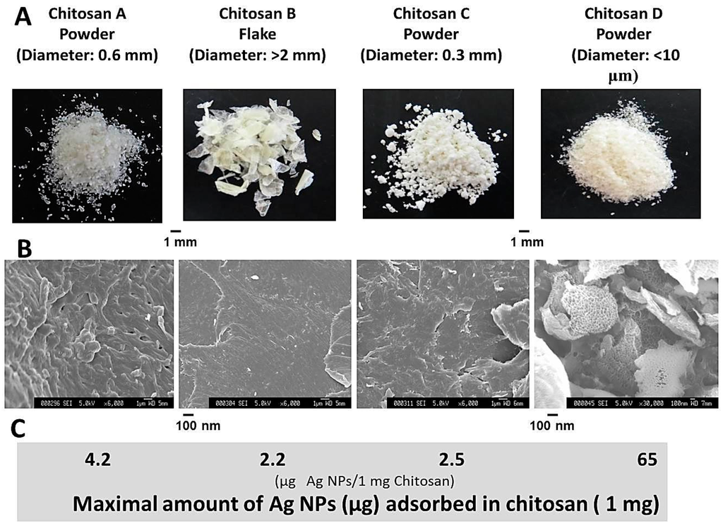 SEM images of chitosan surfaces and binding of Ag NPs. Adsorption of Ag NPs to chitosans with nanoscale porous surface structures was higher than to chitosans with flat/smooth film-like surface structures. (A) Appearance of each chitosan powder (flake); (B) SEM micrographs of each chitosan; (C) Binding of Ag NPs onto each chitosan.