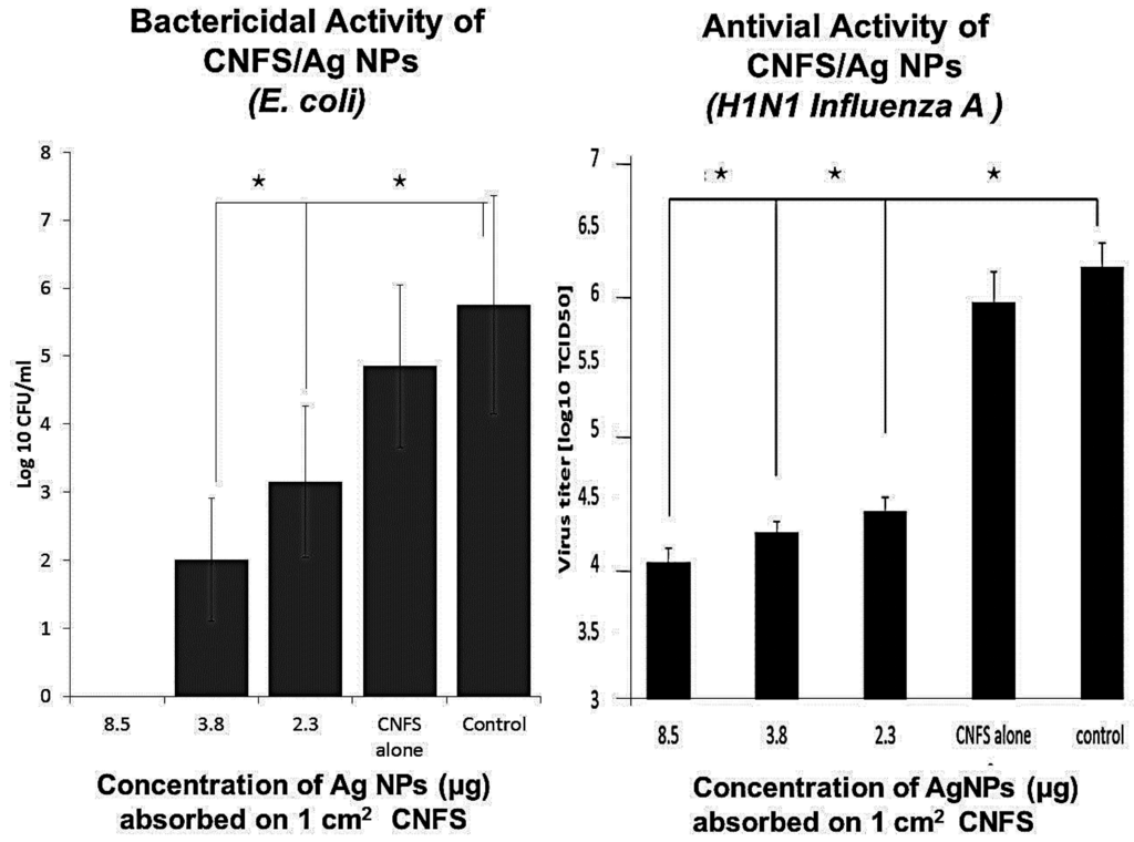 Bactericidal and antiviral activities of various concentrations of Ag NPs on CNFS. Asterisks (*) denote statistically significant differences (p < 0.01) as determined using a two-sample t-test.