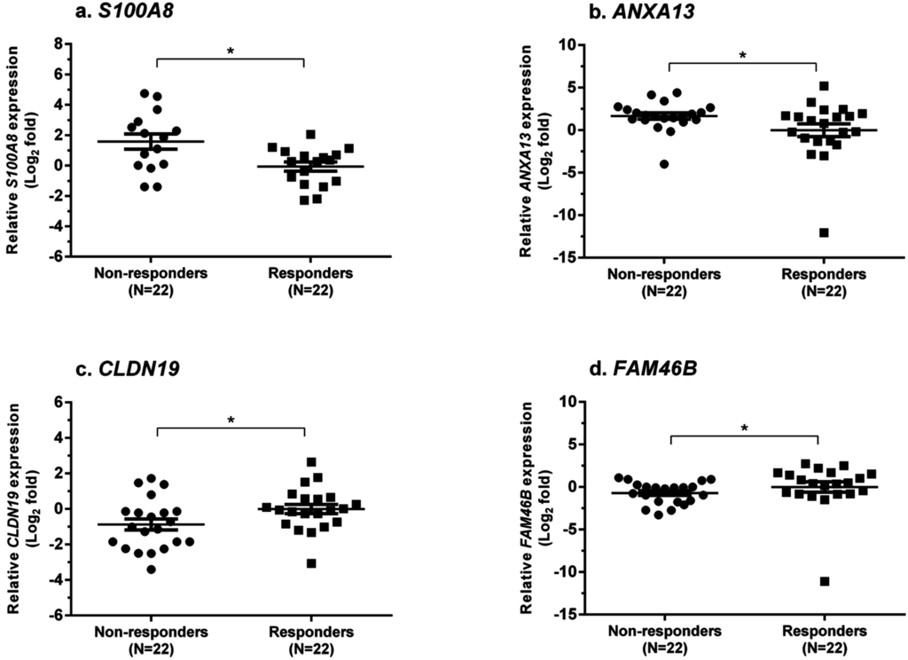 3.6. Statistical Analysis of Real-Time PCR Validation