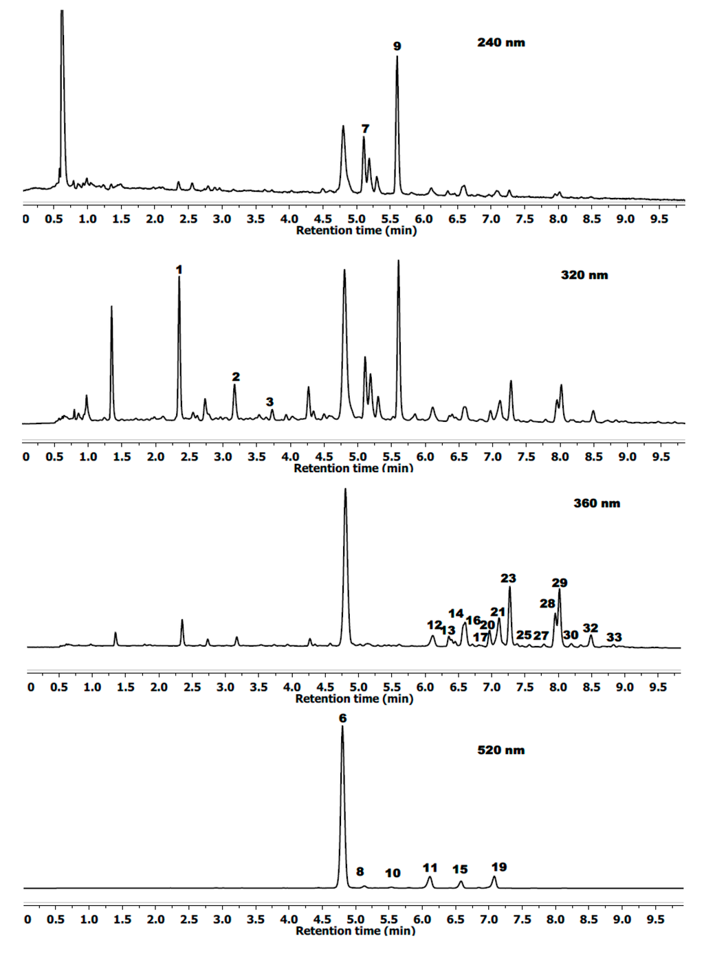 3.4. Identification and Quantification of Polyphenols by the Ultra-Performance Liquid Chromatography–Mass Spectrometry Method