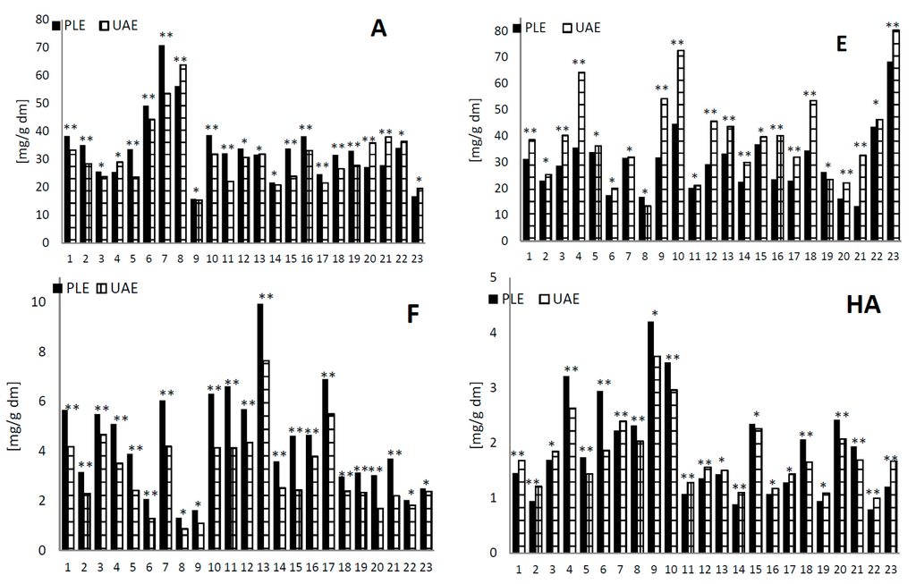 2.2. Analysis of the Extracted Amounts of Phenolic Compounds Using Pressure Liquid Extraction and Ultrasonic-Assisted Extraction Methods